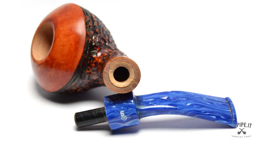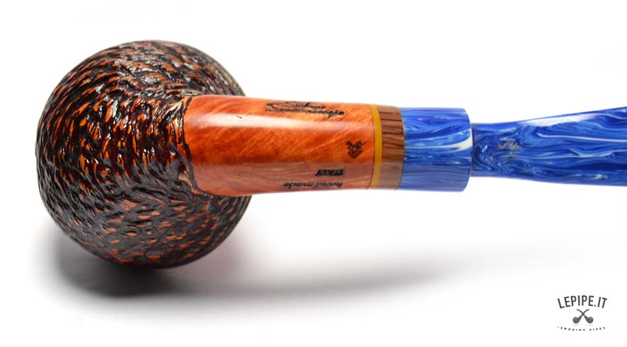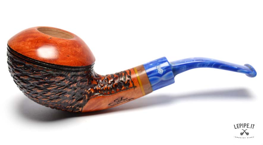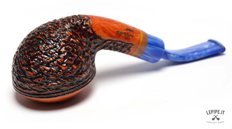 This pipe is handcrafted by Stefano Santambrogio and features a Rhodesian shape with a rustic finish that gives the briar a deep and distinctive texture. The blue metacrylate mouthpiece, paired with an elegant composite material band, completes the design. The pipe is filterless, offering a more natural and direct smoking experience.
