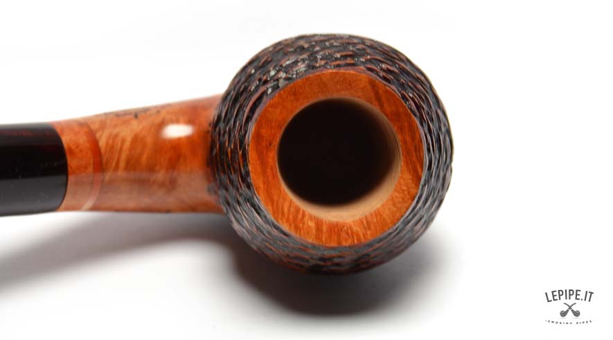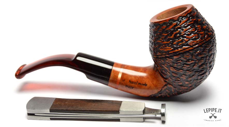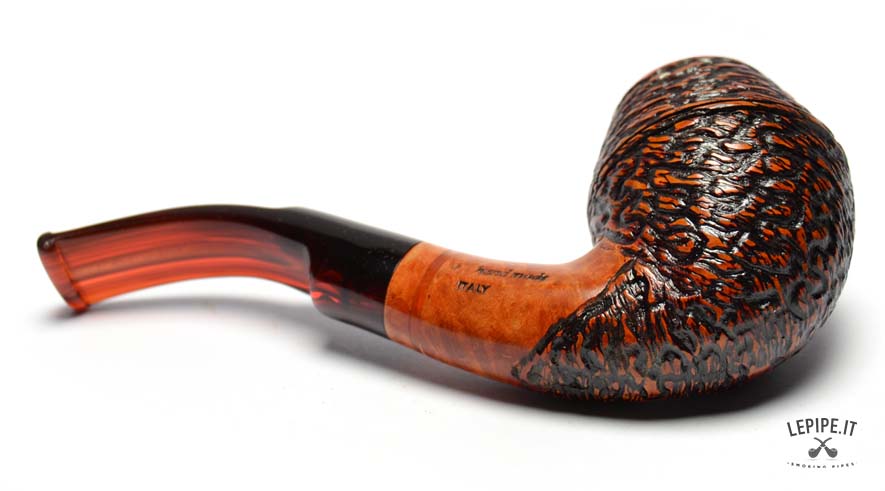 This pipe is handcrafted by Stefano Santambrogio and features a Curved shape with a rustic finish that gives the briar a unique and interesting texture. The bordeaux metacrylate mouthpiece adds an elegant touch, completing the design. The pipe is filterless, offering a more natural smoking experience.