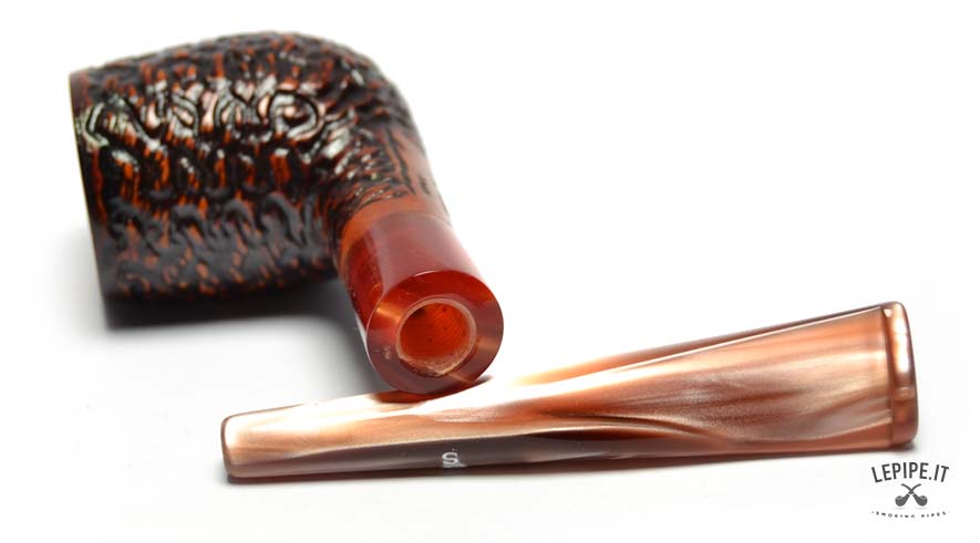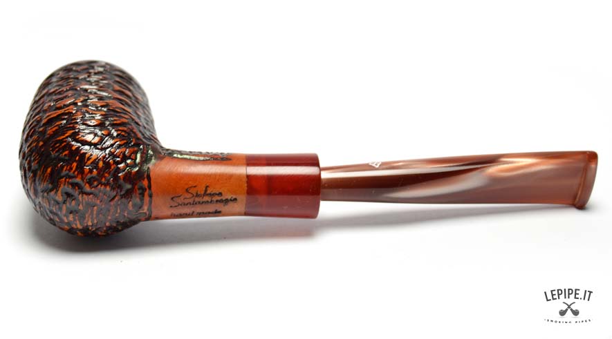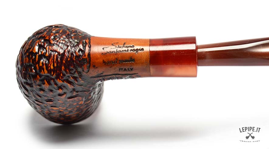 This pipe is handcrafted by Stefano Santambrogio and features a rustic shape with craftsmanship that gives the briar a unique and distinctive texture. The amber-colored metacrylate mouthpiece, combined with the composite material band, adds an elegant touch to the overall design. The pipe is filterless, offering a more natural smoking experience.