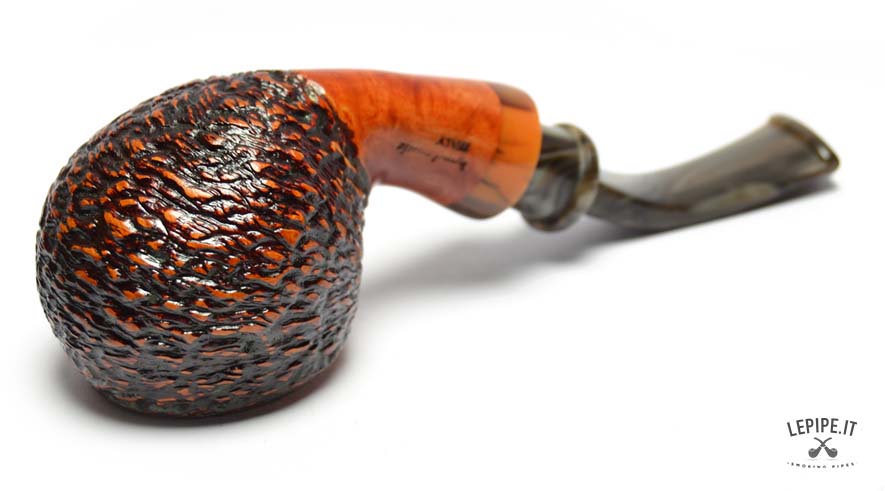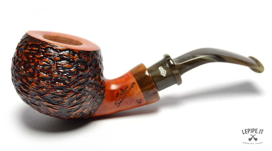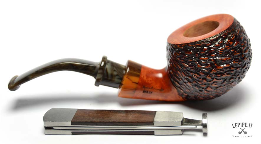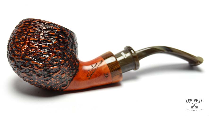Handcrafted by Stefano Santambrogio, this pipe features a Bent Pot shape with a rustic finish that gives the briar a deep texture. The gray metacrylate mouthpiece, paired with the composite material band, enhances the elegant and sophisticated design. Being filterless, it offers a more natural and direct smoking experience.