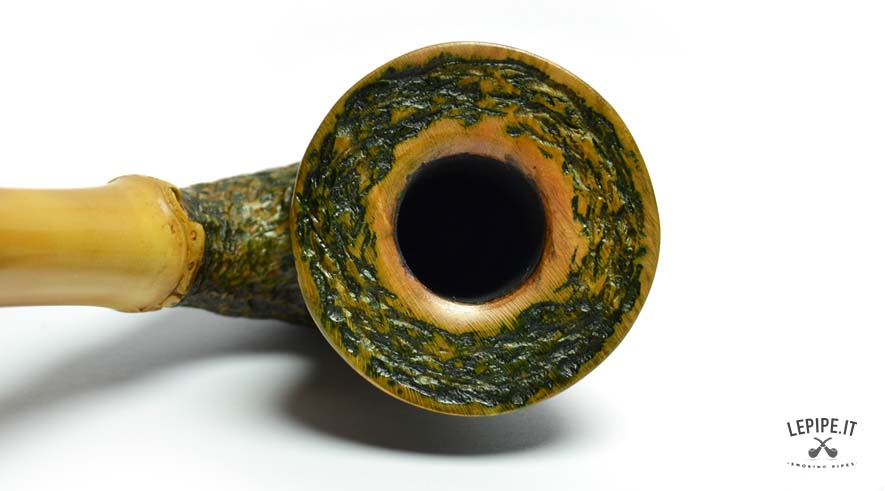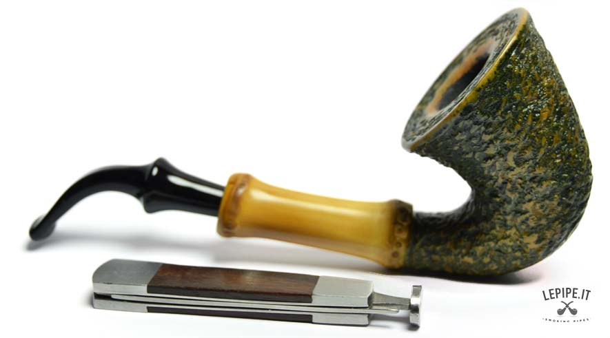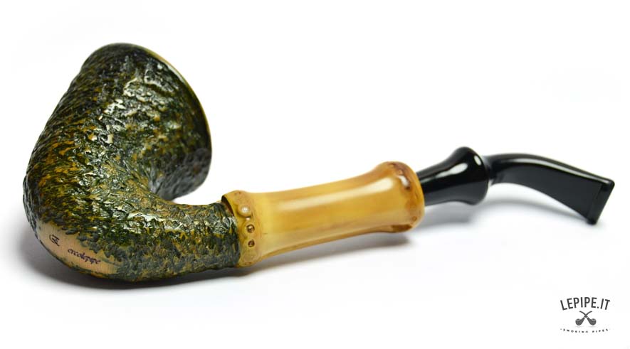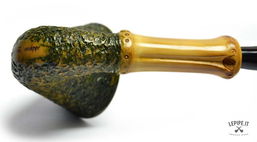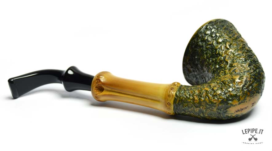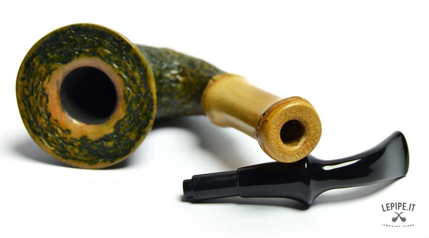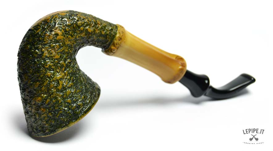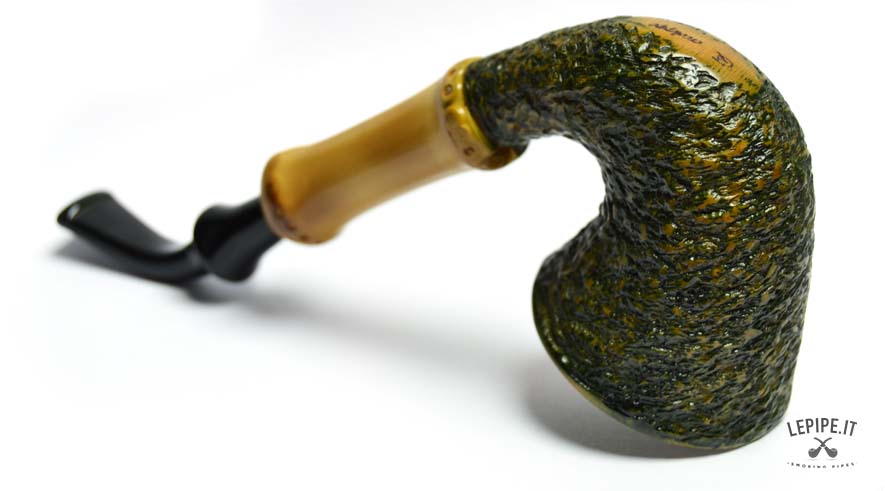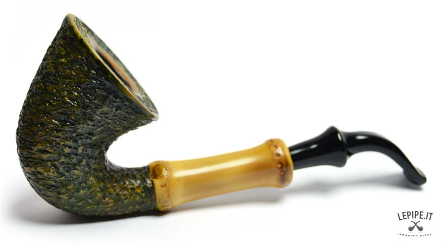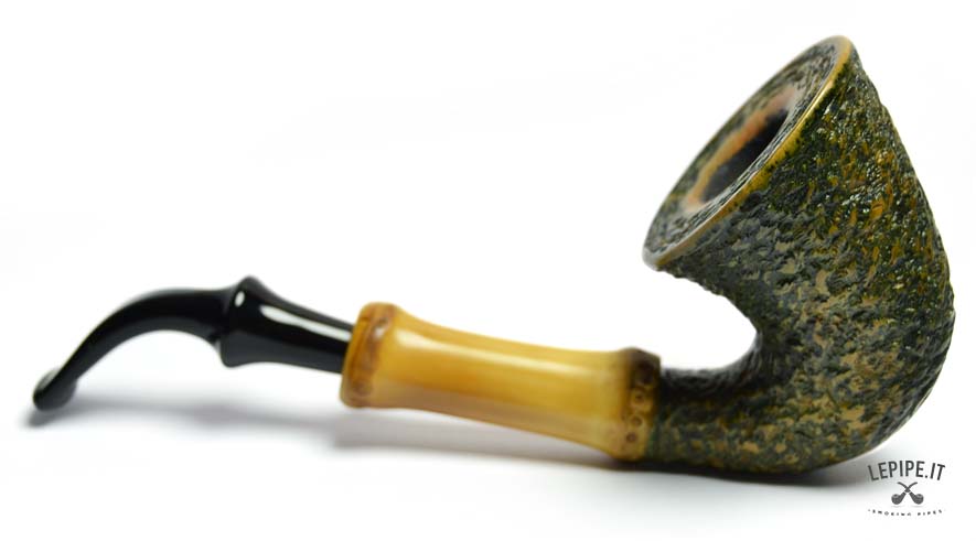 With its slender shape and refined combination of materials, this Bent Dublin by Ercole Bogni stands out as one of the most elegant and original expressions of Italian artisanal pipe making. The 54 mm tall bowl features a deep, irregular rustication with dark green tones that give the piece a vivid, textured appearance. The natural bamboo shank adds an exotic and lightweight touch, perfectly balanced by the curved black methacrylate stem. Weighing only 53 grams, the pipe is comfortable to hold and enjoyable to use, ideal for those seeking a distinctive, lightweight pipe full of character.