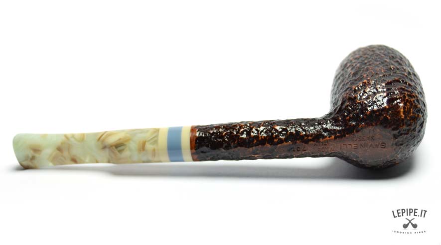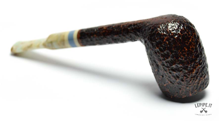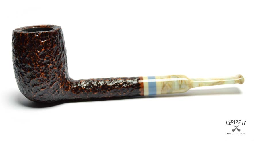 The rusticated finish, inspired by the texture of stone, gives the briar a raw, natural look with deep, earthy tones. The marbled acrylic stem offers a fascinating visual contrast, with its light swirls and irregular patterns, elegantly highlighted by a triple band in ivory, blue, and beige at the junction.