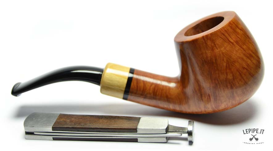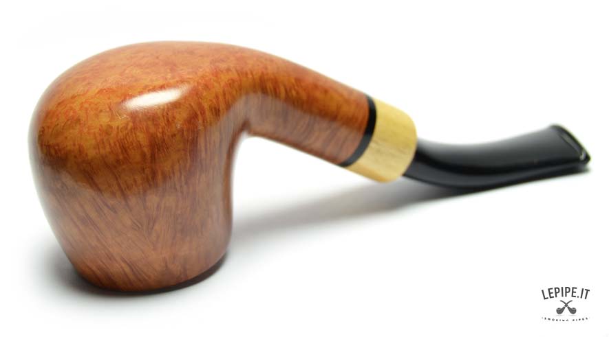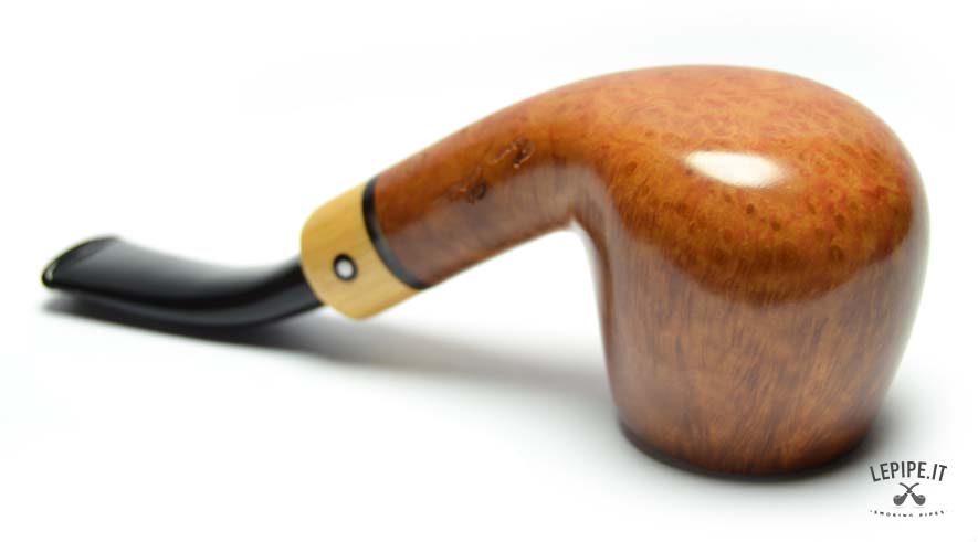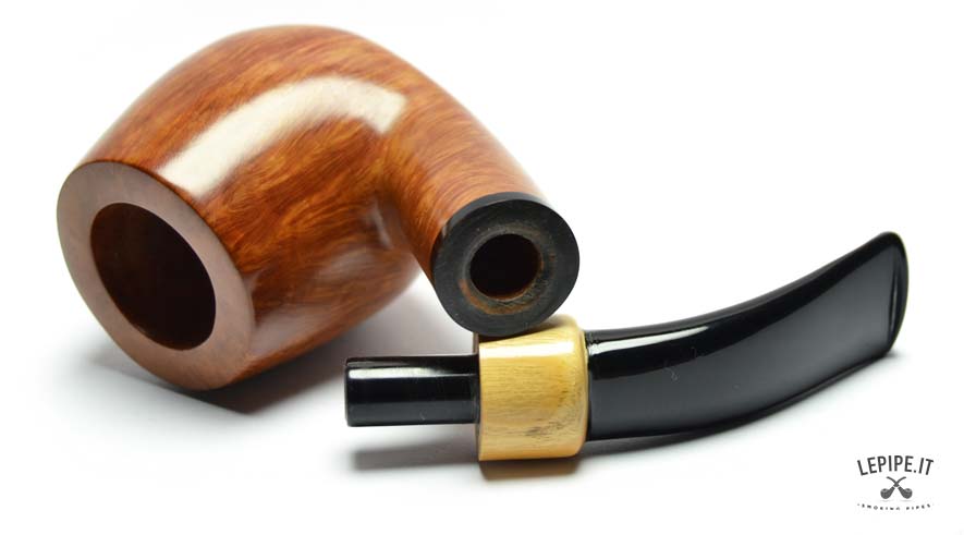 Smooth lines and seamless flow from bowl to shank define this bent Brandy pipe by Spanu, crafted from smooth natural briar with a glossy finish that enhances the light wood grain. The shape is elegant and well-balanced, offering a comfortable grip and a steady smoke. The transition between the shank and the stem features a refined light wood ring with a slim black accent, nicely contrasting the curved, glossy black methacrylate stem. As with all Spanu creations, this is a handmade Italian pipe, filterless, designed to deliver a pure and direct smoking experience — perfect for those who appreciate subtle elegance and quality craftsmanship.
