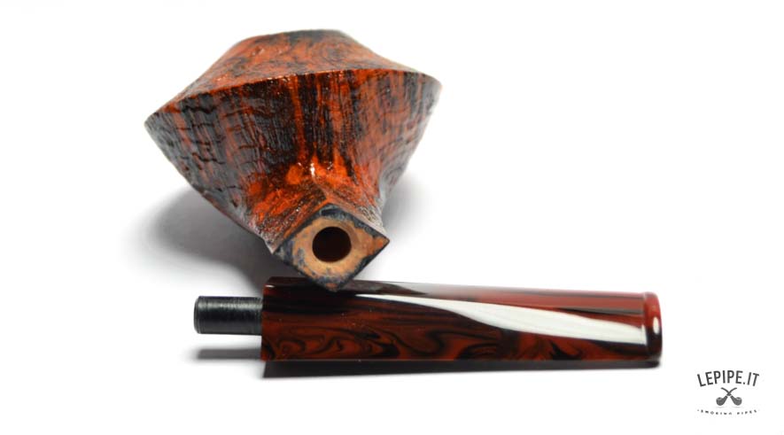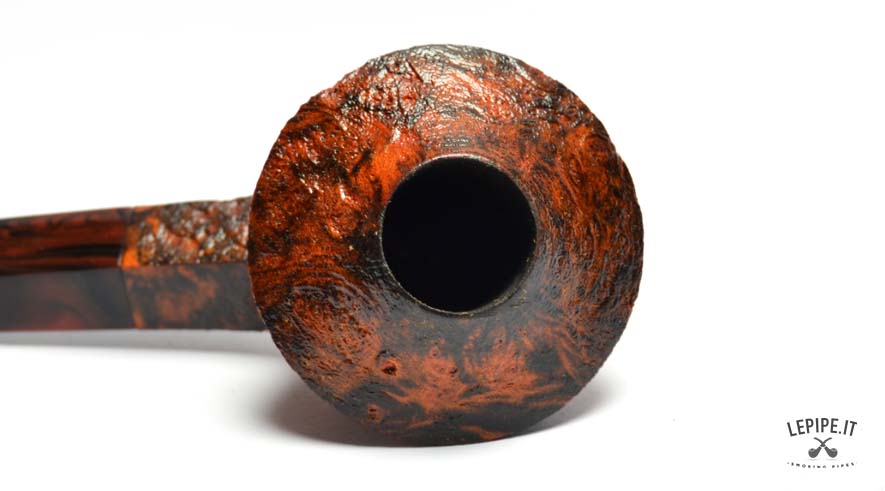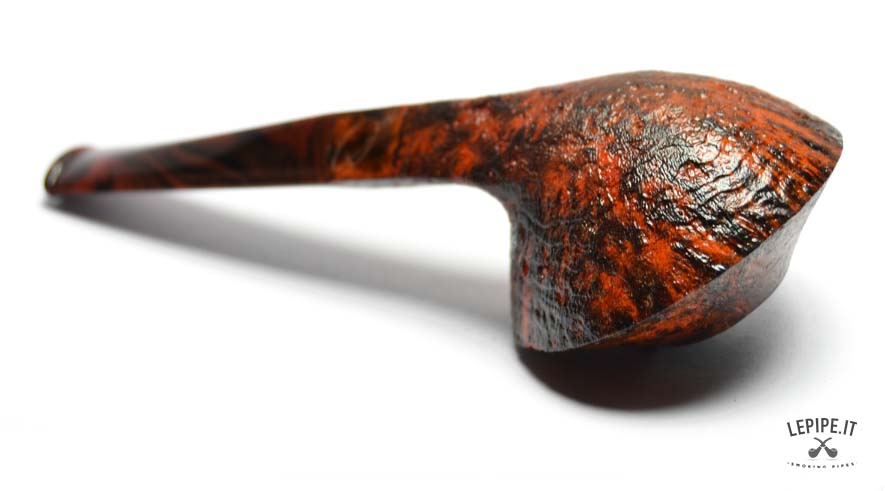 The sandblasted finish, enhanced by warm reddish tones, highlights the natural grain of the briar, creating a dynamic contrast between smooth areas and textured surfaces. The well-defined bowl geometry gives the pipe a solid and contemporary look.