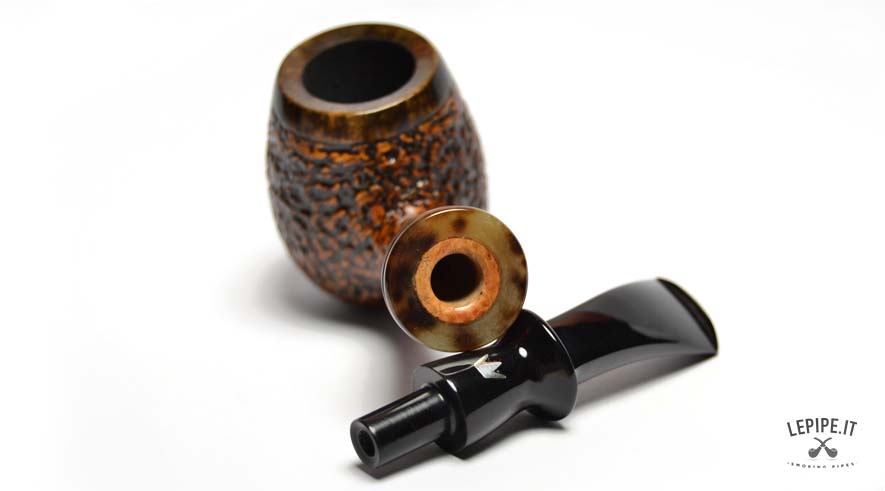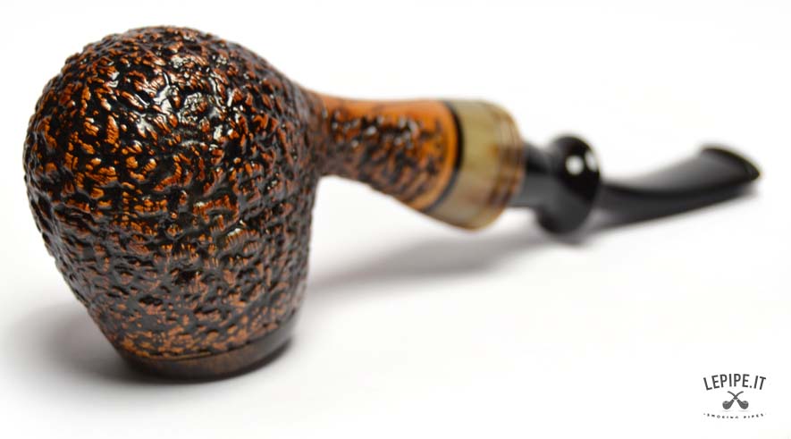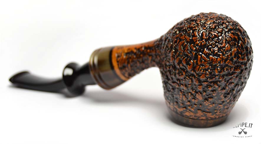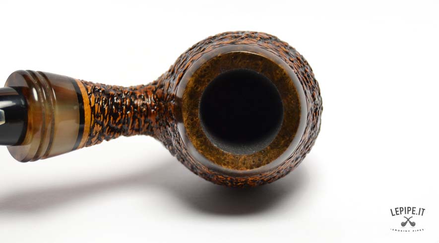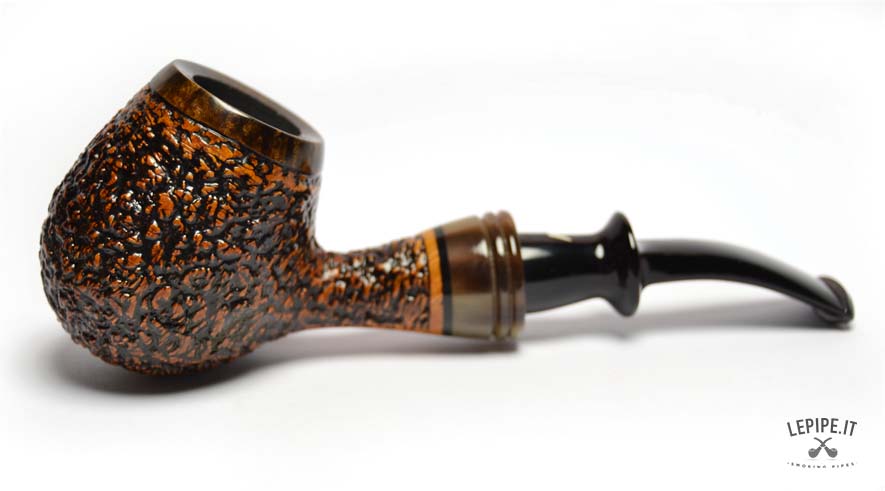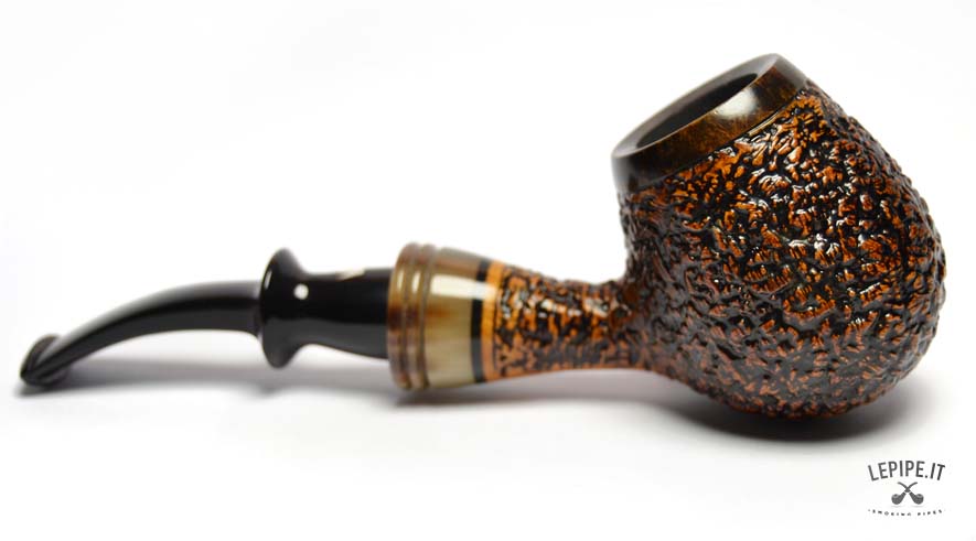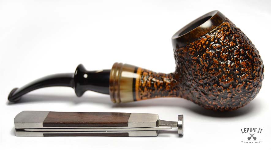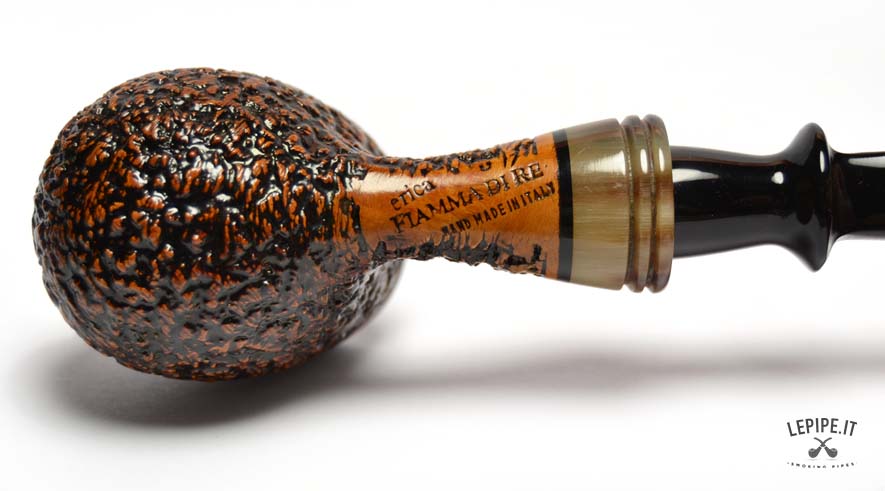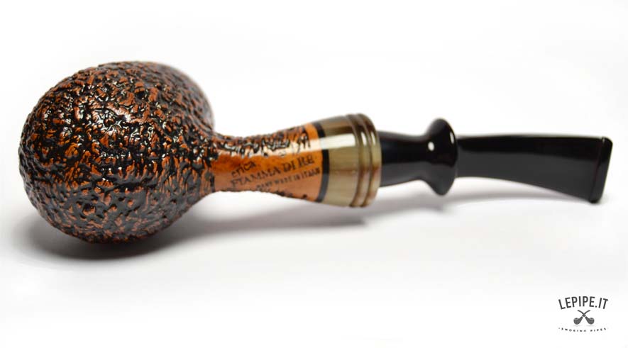 Pipa Fiamma di Re - Erica n. 33  Bocchino in metacrilato Senza filtro Rusticata Con elaborazione in argento Diametro Interno: 19 mm. Diametro Esterno: 41 mm. Lunghezza: 146 mm. Altezza: 51 mm. Peso: 57 gr. Profondità: 39 mm.