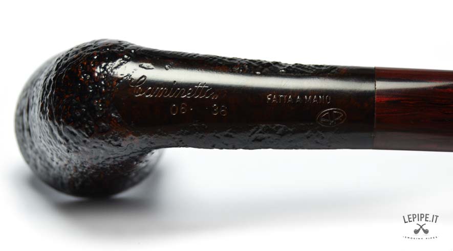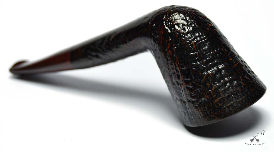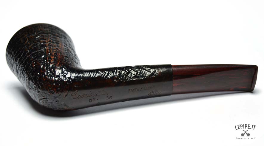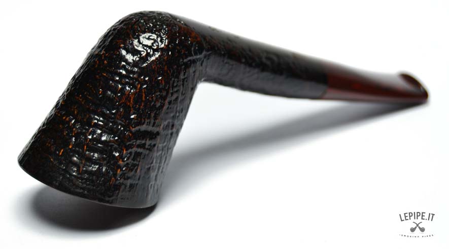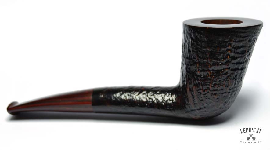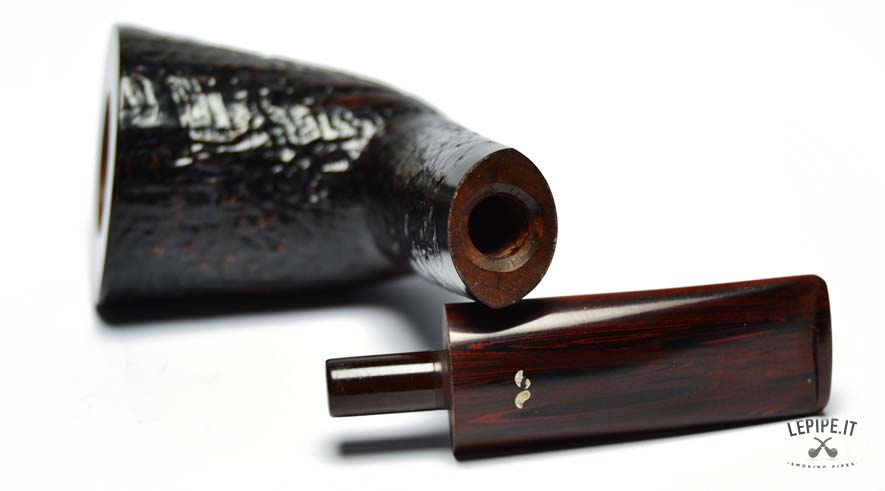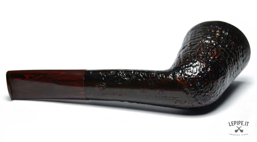 The Caminetto - Sabbiata n. 114 is a semi-bent pipe from Group 2, featuring a dark sandblasted finish that adds tactile texture to the surface and gives it a rustic charm. The bowl has a 20 mm inner diameter and a 38 mm outer diameter, with a total length of 133 mm. Weighing 39 g and standing at 49 mm in height, this pipe offers a comfortable smoking experience with a robust design. The cumberland stem adds elegance and durability. Priced at €250.00, you can save up to €18.34 with discount points.