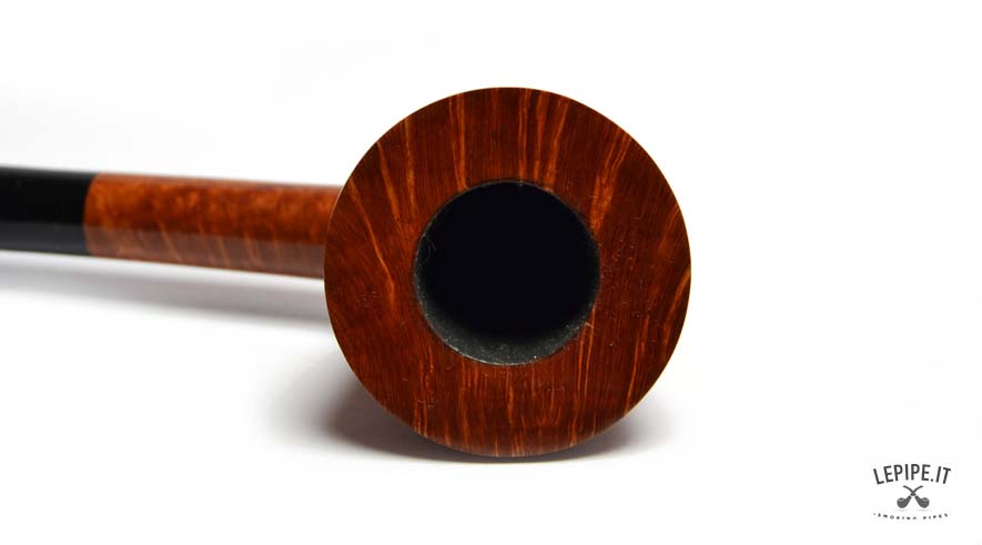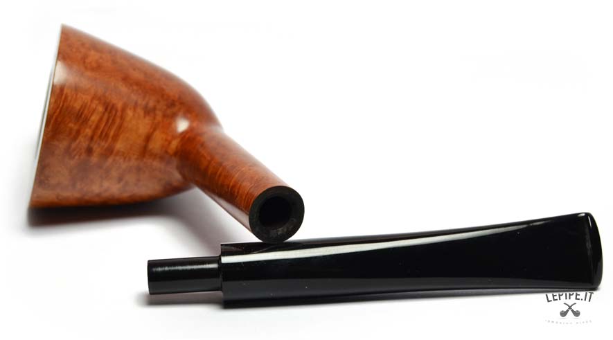 The shank, straight and well-proportioned, connects seamlessly to the polished black acrylic stem. The slight curve of the stem provides a comfortable grip and excellent balance, making it ideal for prolonged smoking sessions.
