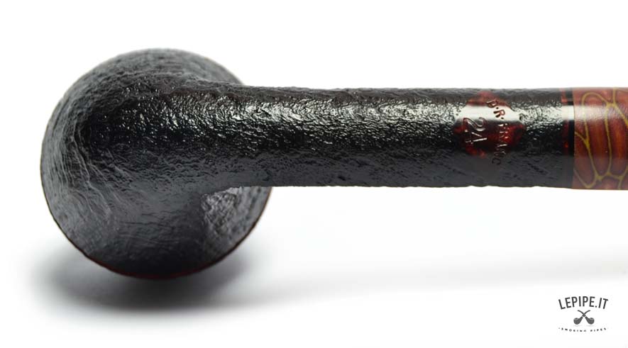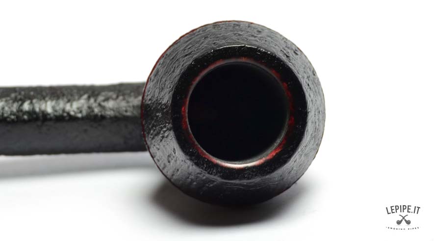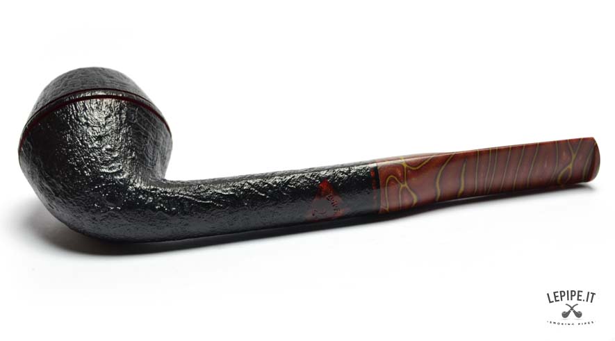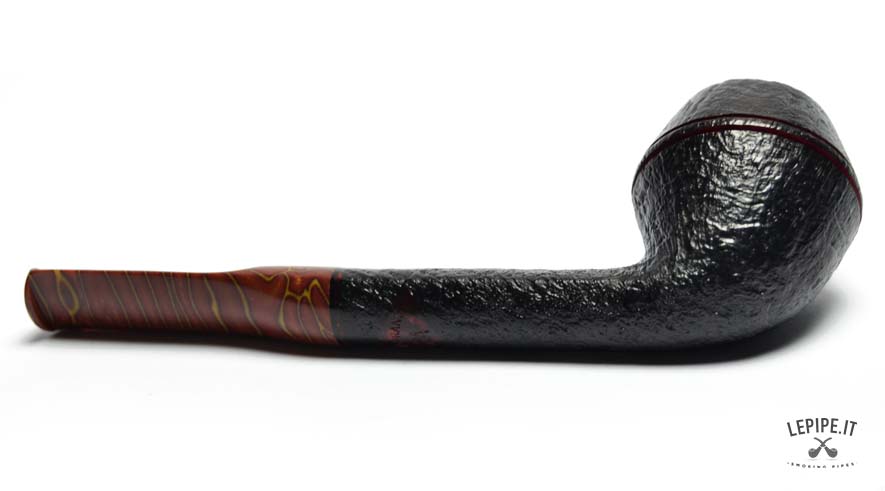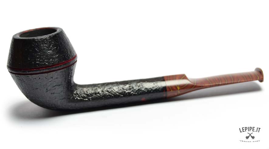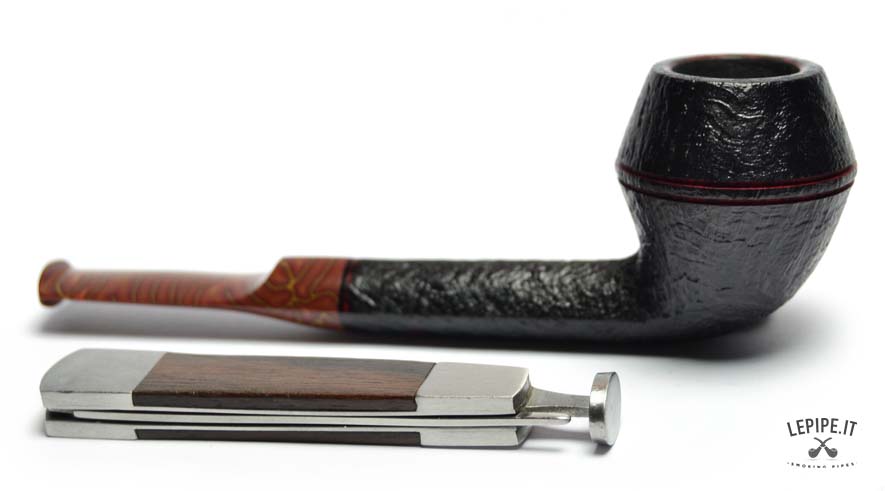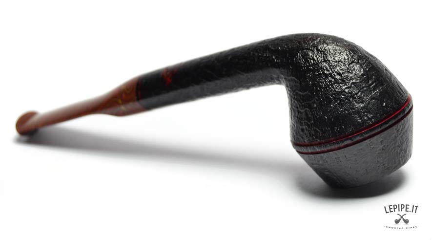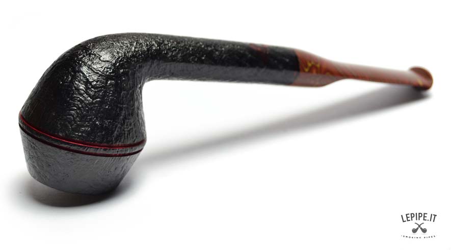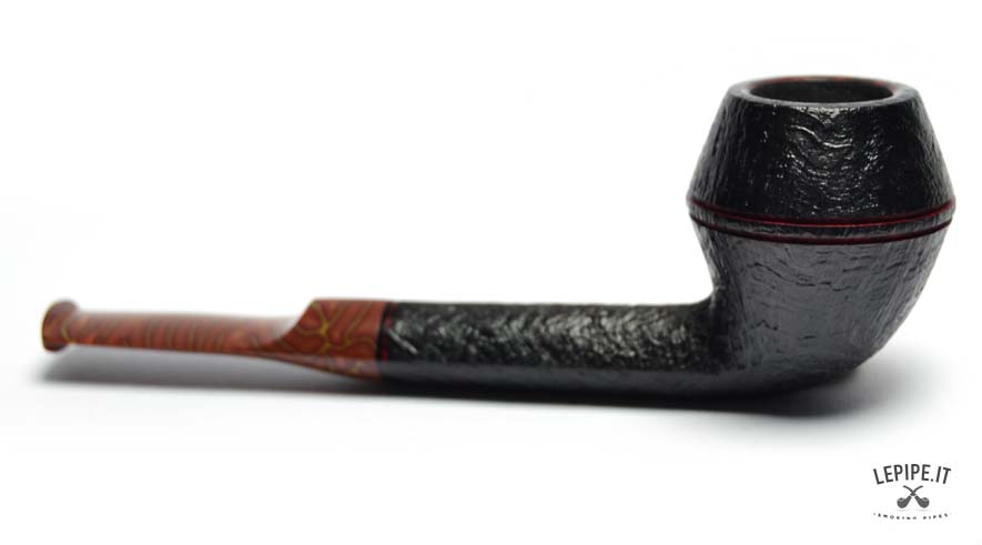 The pipe’s body is crafted from premium briar with a dark sandblasted finish, accentuating the wood's natural texture and adding depth to the design. Two fine red rings carved around the upper part of the bowl provide a distinctive touch.