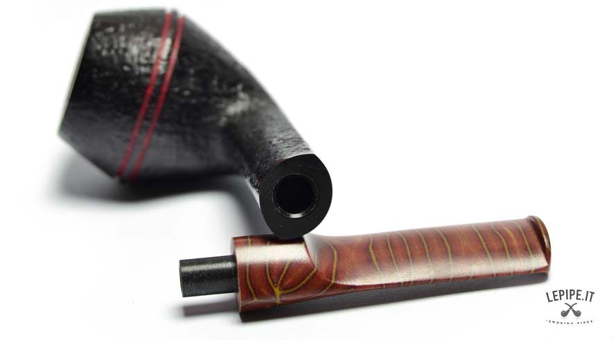 The stem, made of marbled methacrylate, displays warm shades of red and yellow, creating a striking contrast with the dark body. The material ensures long-lasting durability and exceptional comfort during use.