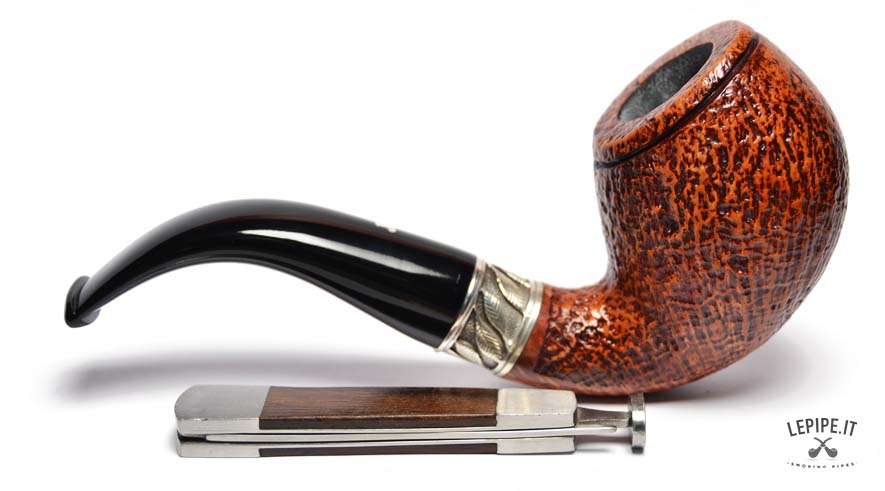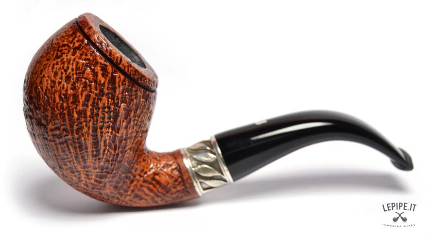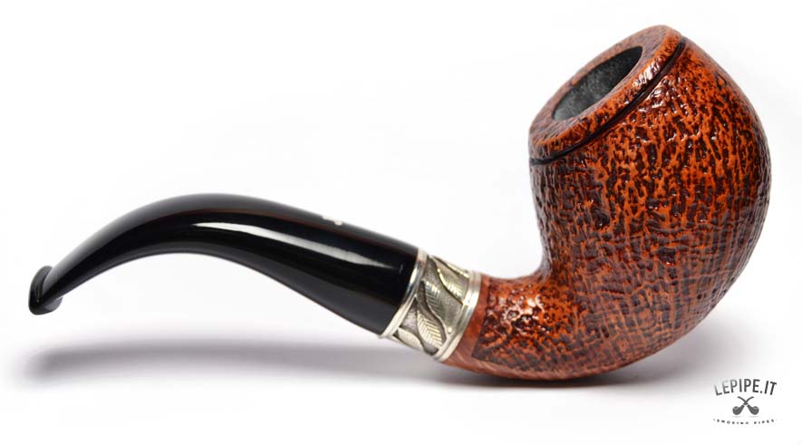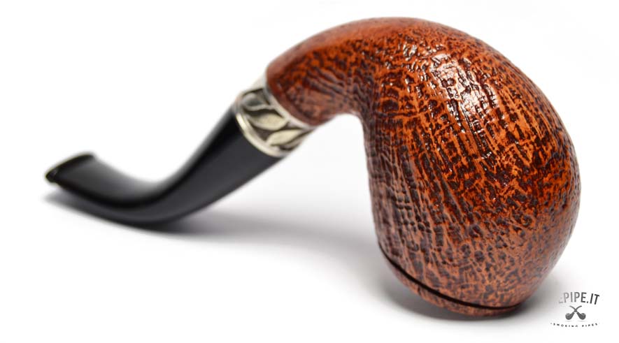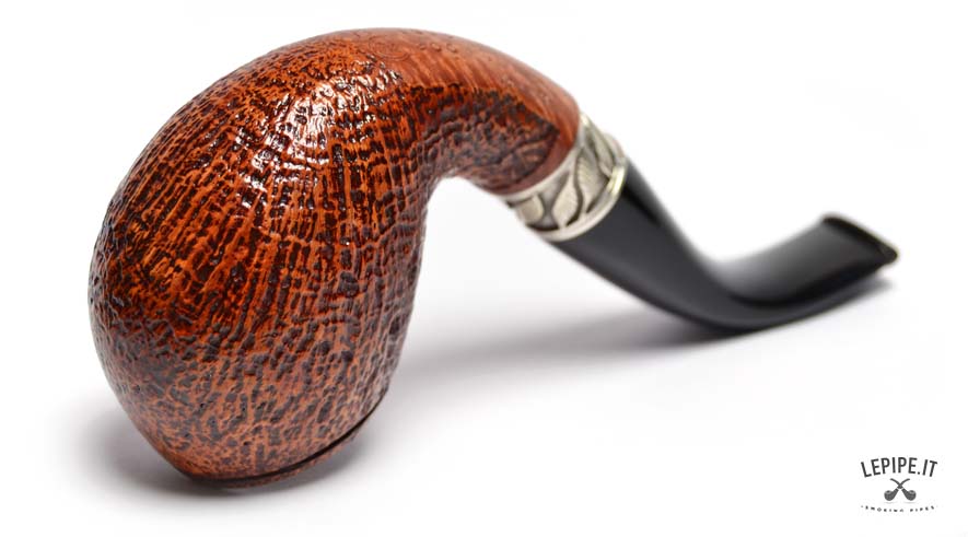 The surface is sandblasted (S2), a finish that enhances the texture of the briar, highlighting its natural grain and giving the pipe a unique character. The curved stem, made of polished acrylic, is designed to provide a comfortable smoking experience and an ergonomic grip.
