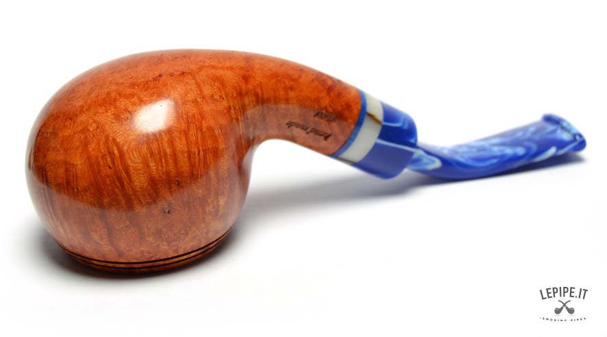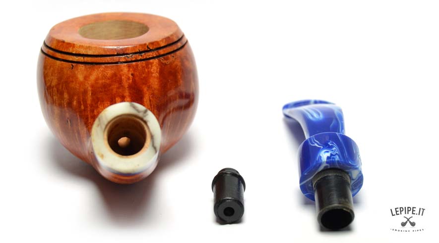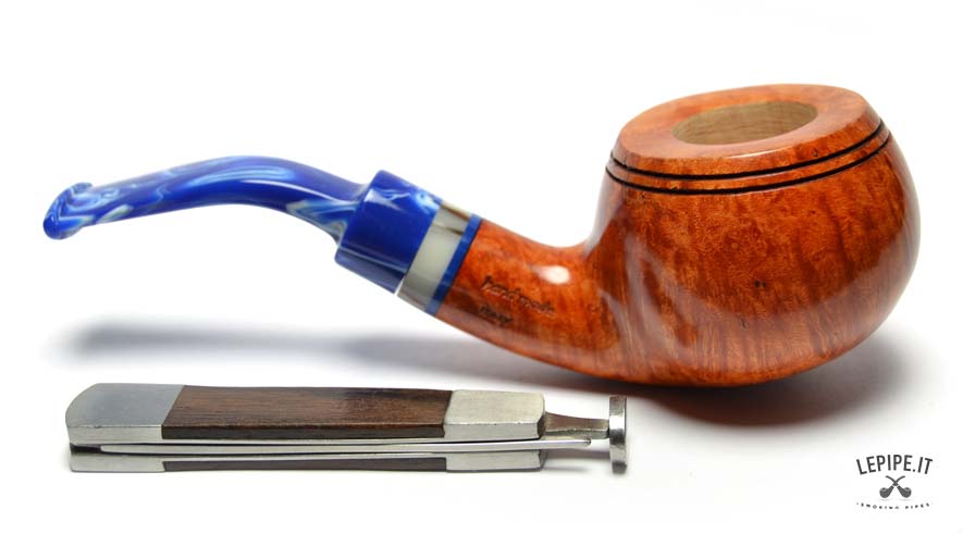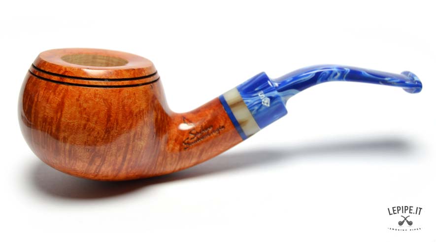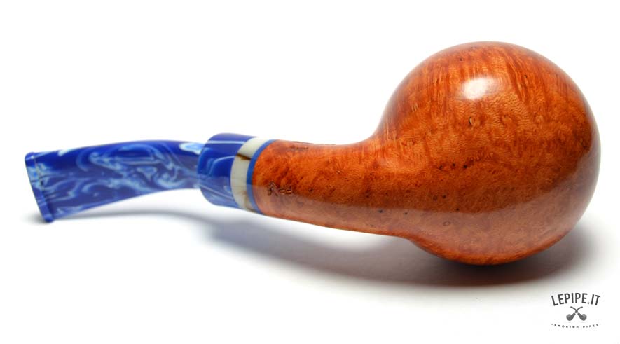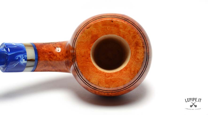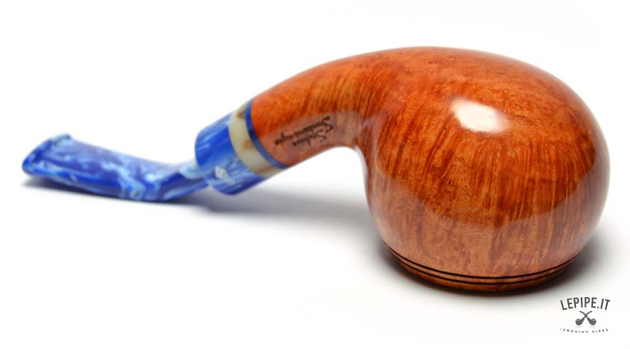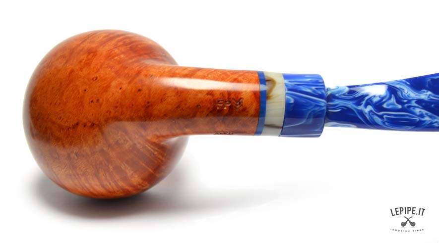 The marbled blue acrylic stem, with its elegant light veining, creates a striking contrast with the pipe’s body. The decorative shank extension in ivory and blue tones adds further refinement, enriching the overall look with a sophisticated detail.