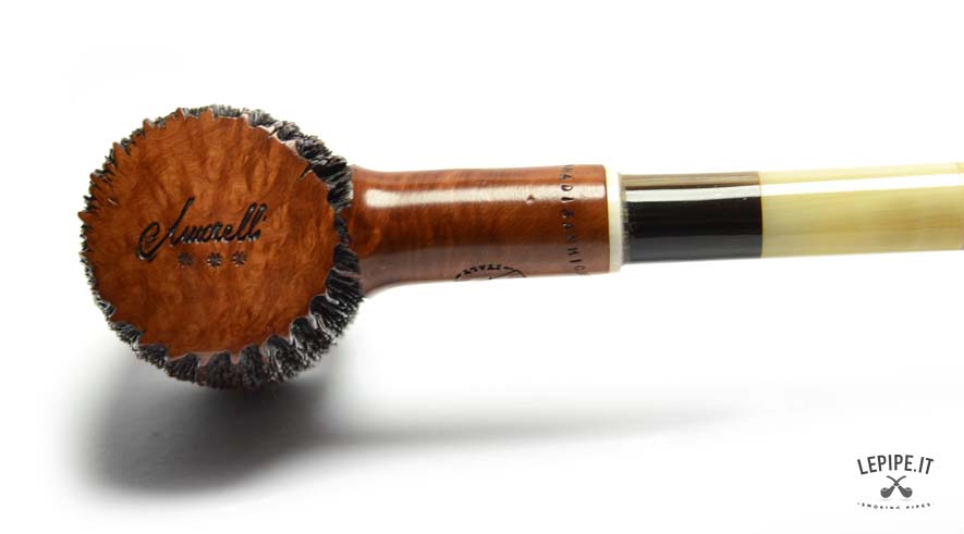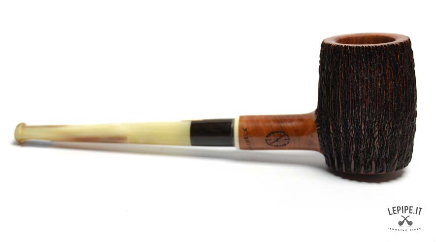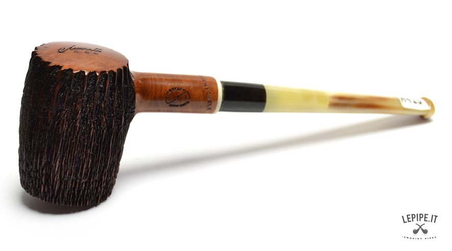 The Amorelli 3 Stelle Poker Stand-Up pipe is a tribute to functional simplicity, enriched with handcrafted details that give it a distinctive personality. Its classic Poker shape, with a cylindrical bowl and flat bottom, allows the pipe to stand upright on its own, offering excellent stability and practicality for everyday use. The bowl is made from quality Italian briar and features a tightly carved vertical rustication that adds strong visual texture and contrast against the smooth, polished shank. A standout feature is the horn stem, with its natural, multicolored marbling that makes each piece truly one of a kind while adding a rustic and authentic charm. The transition between shank and stem is accentuated by a dark ring that elegantly separates the warm wood from the horn’s organic tones. This pipe is part of the 3 Stelle line, Amorelli’s designation for well-made pipes offering solid performance and personality at an accessible level. A reliable and visually striking pipe, designed to bring everyday smoking pleasure with understated elegance.
