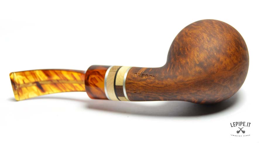 The amber-toned acrylic stem, compact and smoothly curved, connects to the shank through the Oregon line’s signature multi-material band, blending metal, light wood, and resin for a modern, distinctive accent.