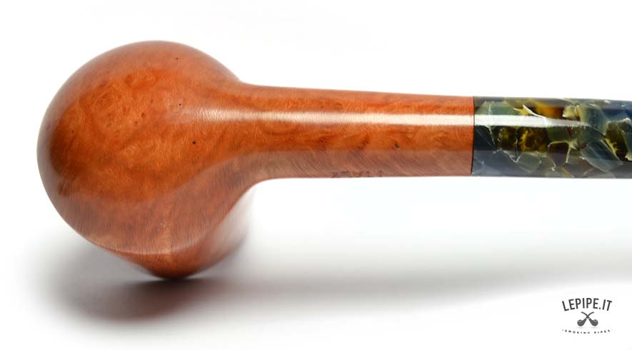 The smooth, warm-toned briar finish highlights the natural grain of the wood, offering a clean, classic aesthetic. What sets this piece apart is its unique stone-effect methacrylate stem, featuring swirls of green, blue, and gold for a bold, contemporary twist on a traditional form.