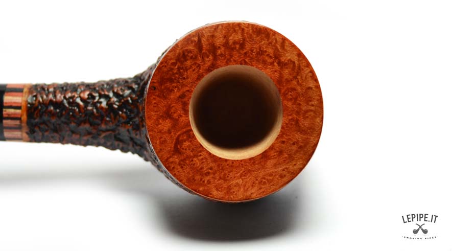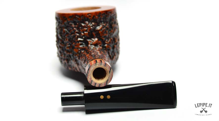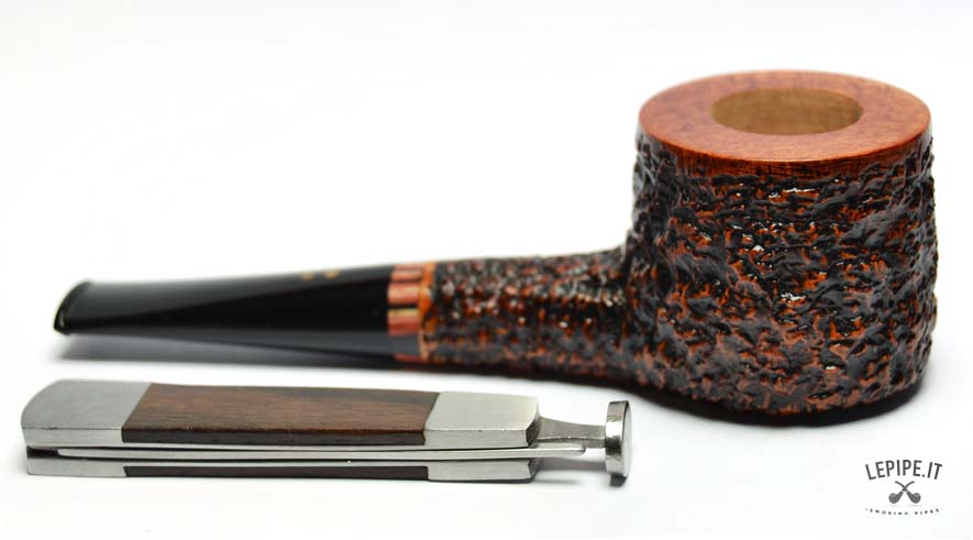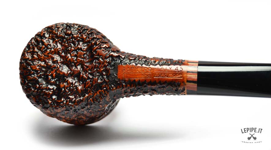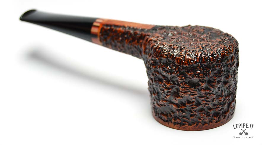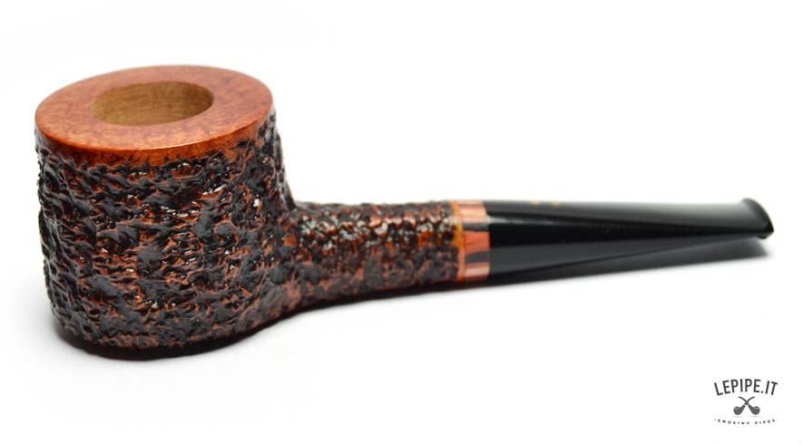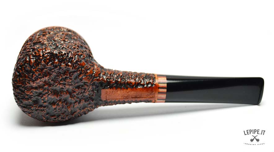 A compact and essential pipe by Radice, blending clean lines with functional design. The traditional Pot shape, with its low and wide bowl, is enhanced by a deep rusticated finish that gives the briar a strong tactile presence, while the smooth rim adds a refined visual contrast.