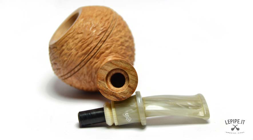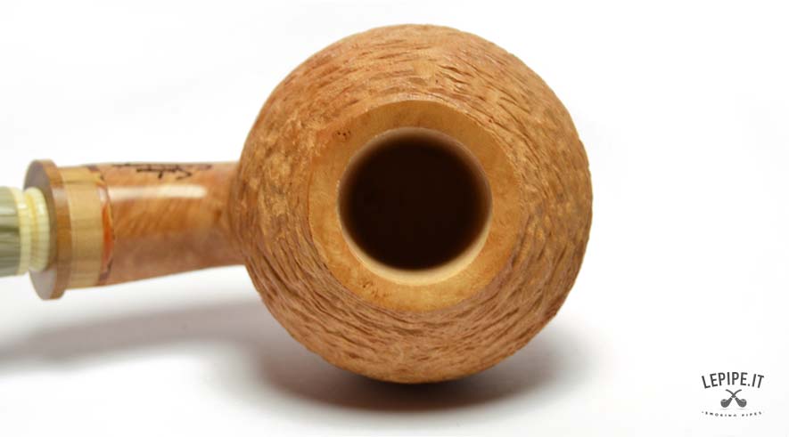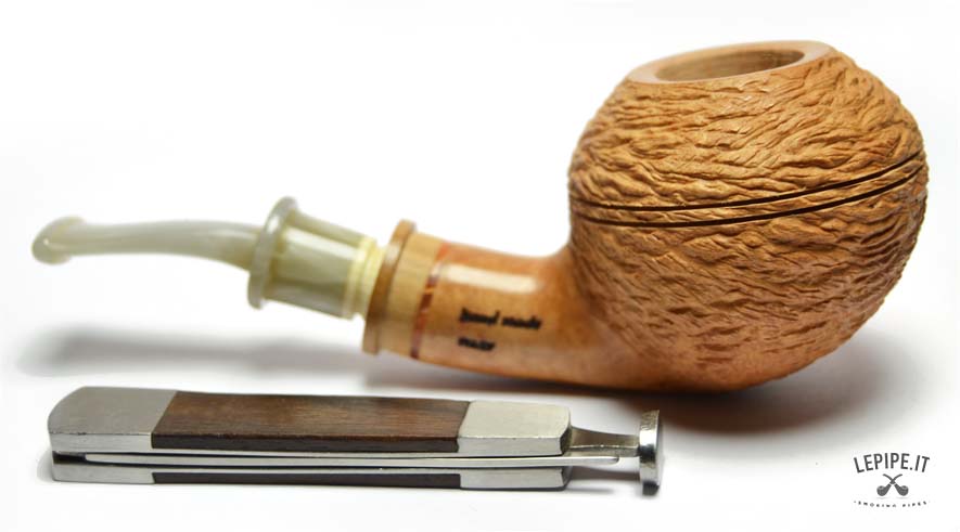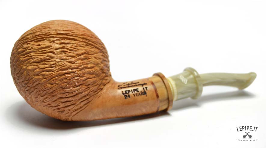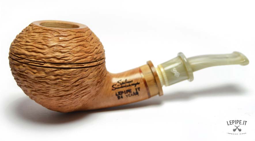 Pipa Santambrogio - 24° Ann. lepipe.it n. 2 Con pigino in ulivo in omaggio Bocchino in metacrilato Senza filtro Sabbiata Con altra elaborazione Diametro Interno: 21 mm. Diametro Esterno: 52 mm. Lunghezza: 123 mm. Altezza: 49 mm. Peso: 61 gr. Profondità: 38 mm.