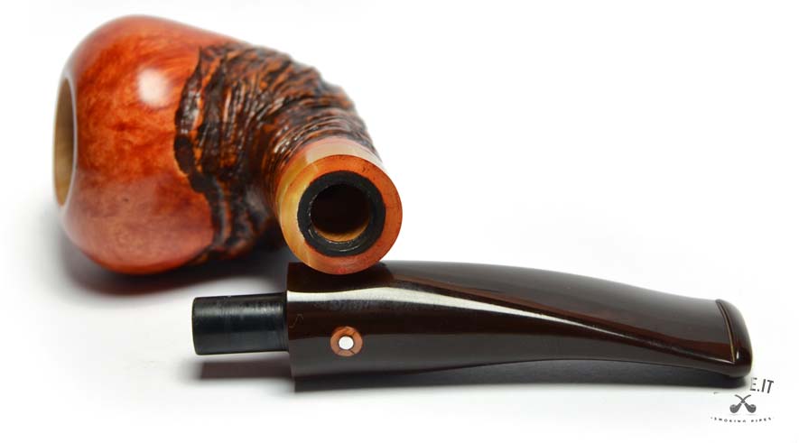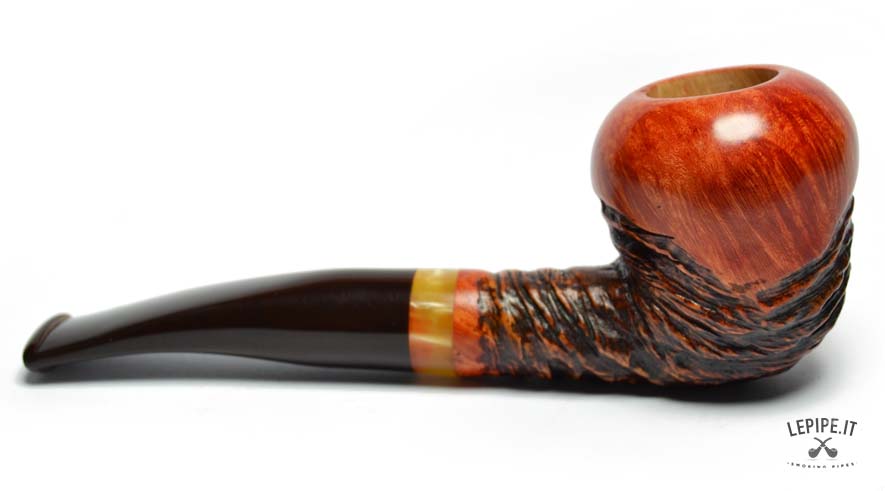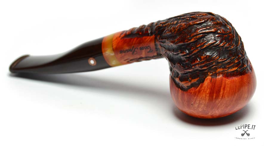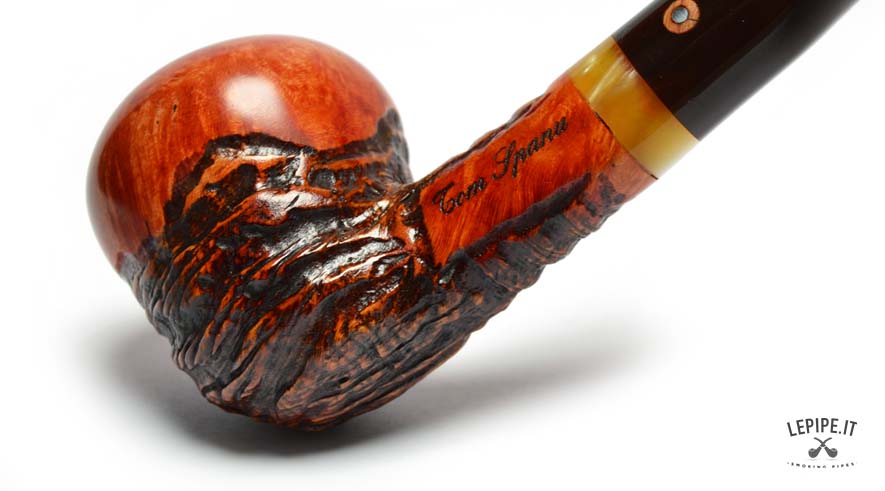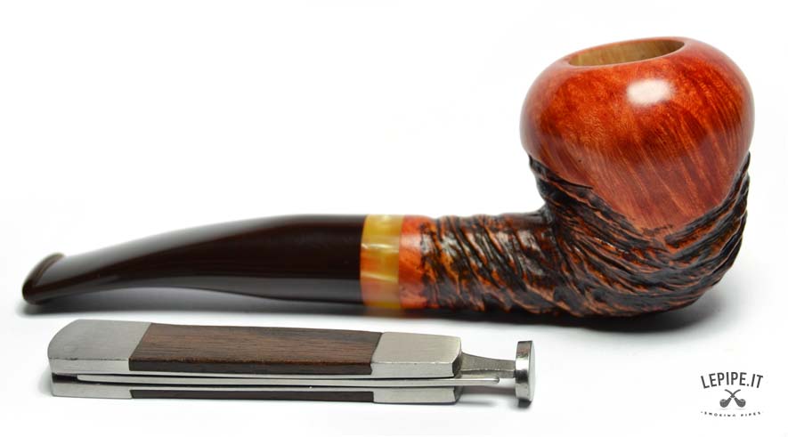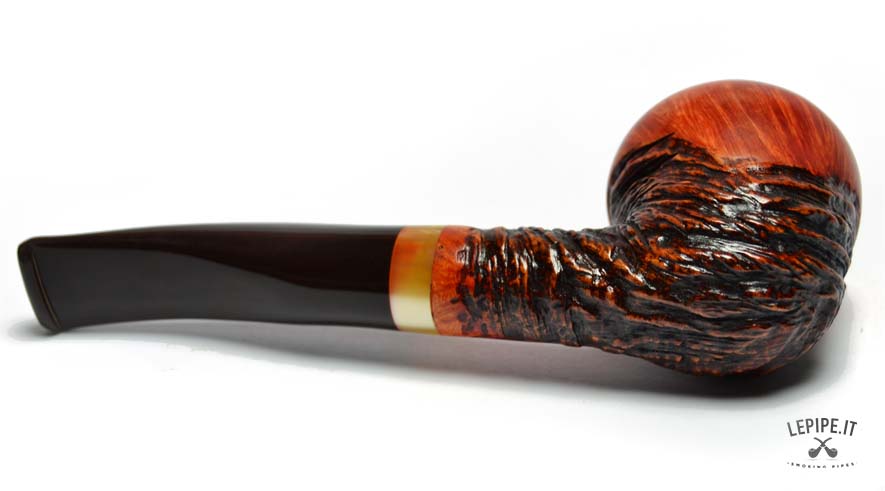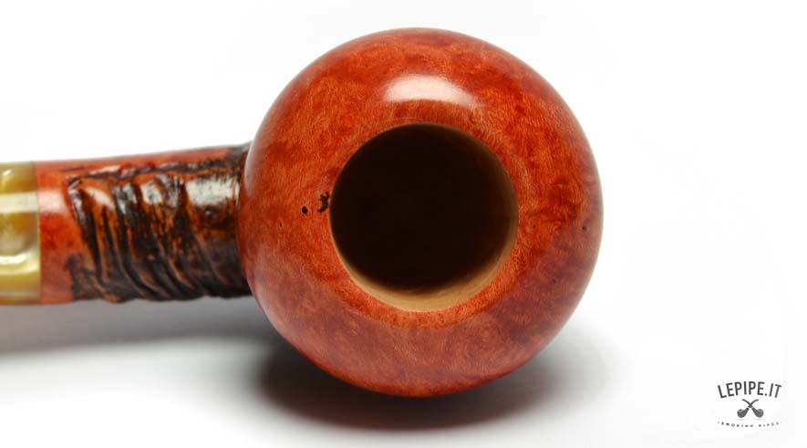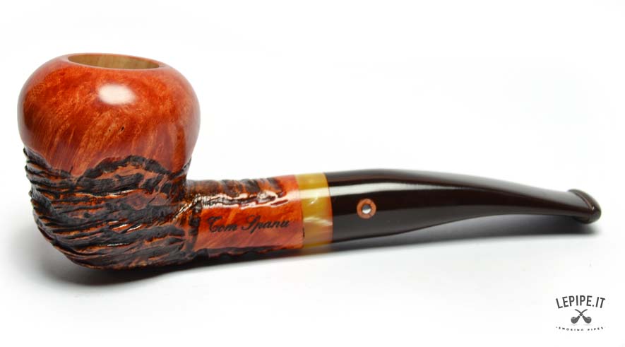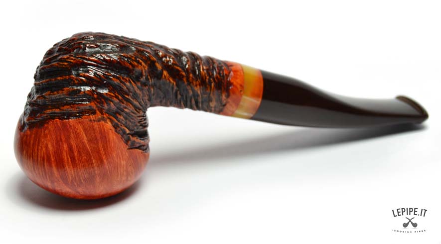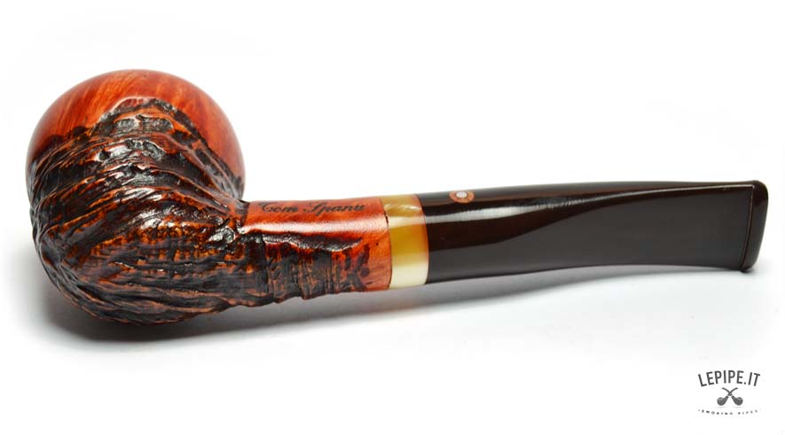 Questa straordinaria pipa firmata Tom Spanu incarna l’arte dell’artigianato, unendo materiali di pregio e un design che richiama la natura in tutta la sua bellezza. Realizzata in radica di altissima qualità, presenta un’affascinante combinazione di superfici lisce e rusticate. La parte liscia, con il suo caldo colore arancio-rossastro, mette in evidenza le venature uniche del legno, mentre la sezione rustica si distingue per una texture scolpita che ricorda le curve e i rilievi di un paesaggio naturale. Il fornello dalla forma arrotondata offre un generoso spazio per il tabacco e garantisce una fumata piacevole grazie alle pareti spesse che mantengono il calore in modo uniforme. Il cannello, leggermente curvo, si collega a un bocchino in acrilico marrone scuro, decorato con un elegante anello in tonalità ambrate che aggiunge un tocco di raffinatezza e modernità. L’incisione “Tom Spanu” sul cannello sottolinea la qualità e l’autenticità di questa pipa, simbolo di una maestria che unisce tradizione e innovazione. La giunzione del bocchino è progettata per essere facilmente smontabile, rendendo la manutenzione semplice e pratica, ideale sia per collezionisti che per fumatori alla ricerca di un pezzo unico e funzionale. Questa pipa è molto più di un semplice oggetto: è un’opera d’arte che trasforma ogni fumata in un’esperienza unica. Perfetta da utilizzare in momenti di relax o da esporre come gioiello di una collezione, rappresenta il meglio dell’artigianato italiano, esaltando la bellezza della radica con uno stile inimitabile.