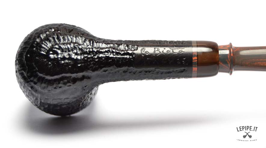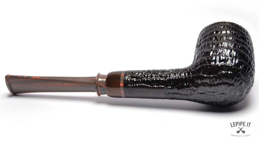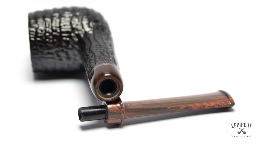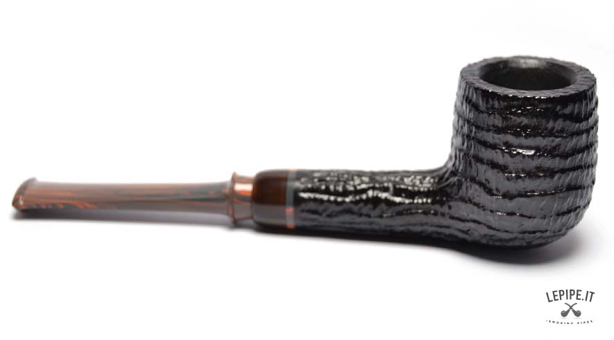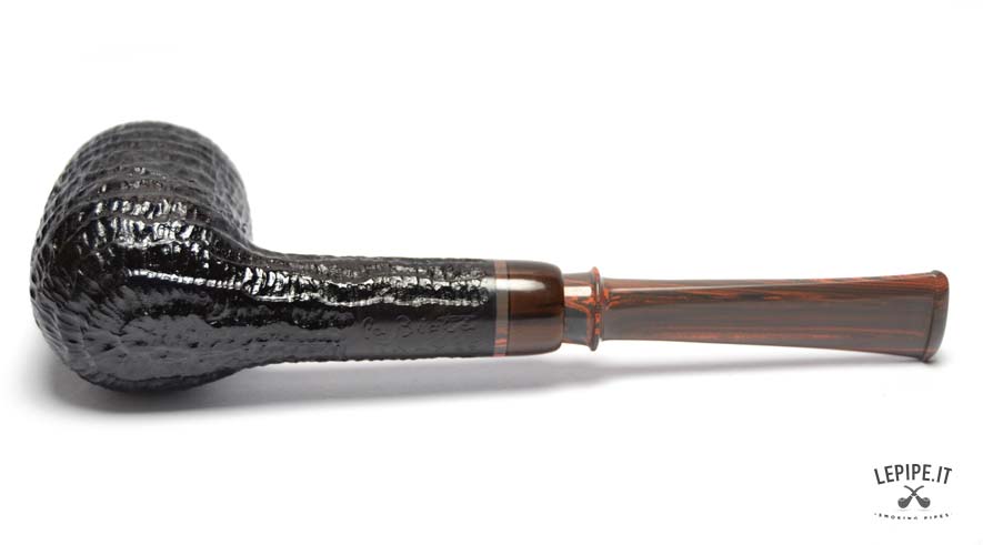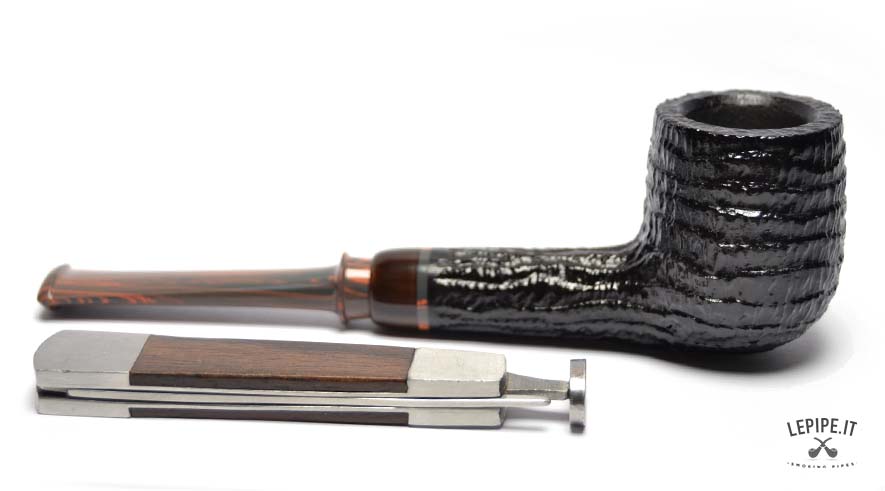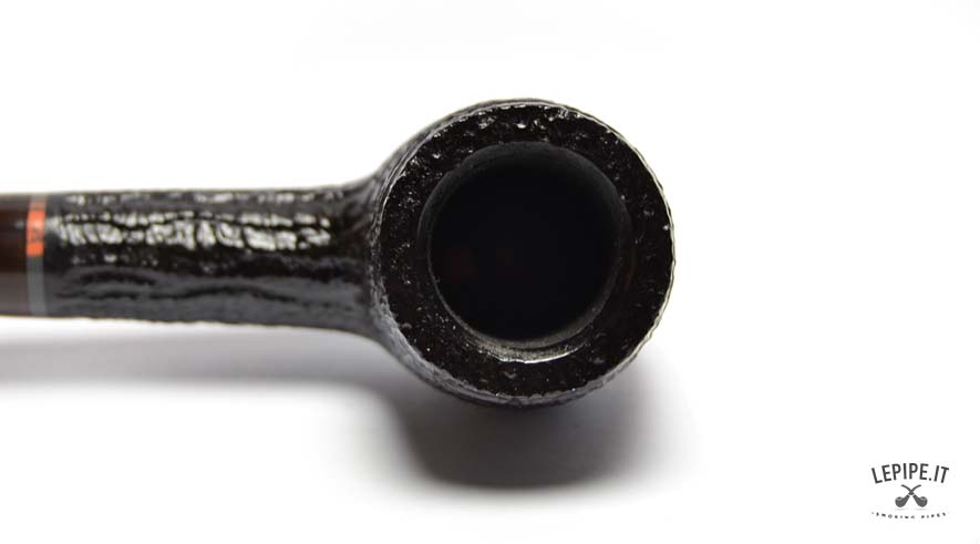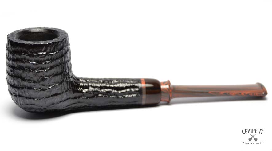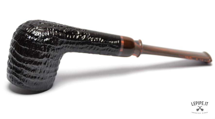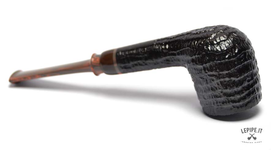 Il fornello presenta una splendida finitura sabbiata, con profonde scanalature che esaltano la texture naturale della radica. La colorazione nera lucida dona un tocco di raffinatezza e un carattere deciso, rendendo questa pipa un pezzo dall’estetica sofisticata.