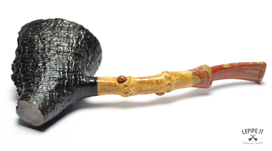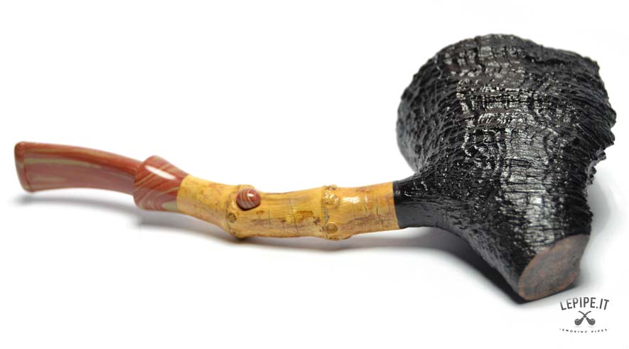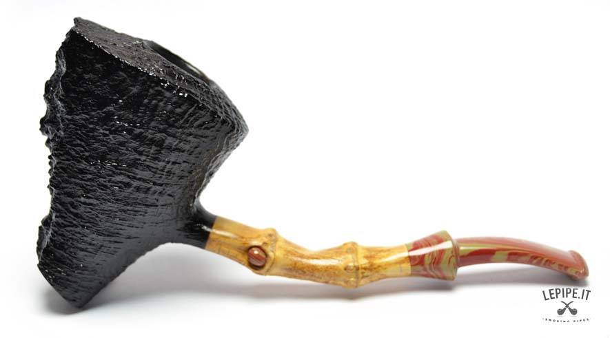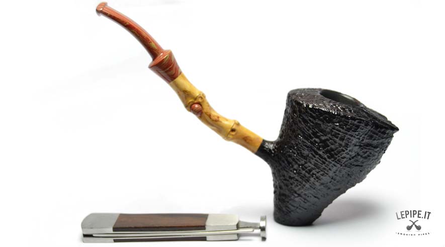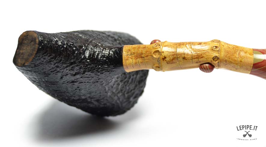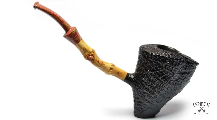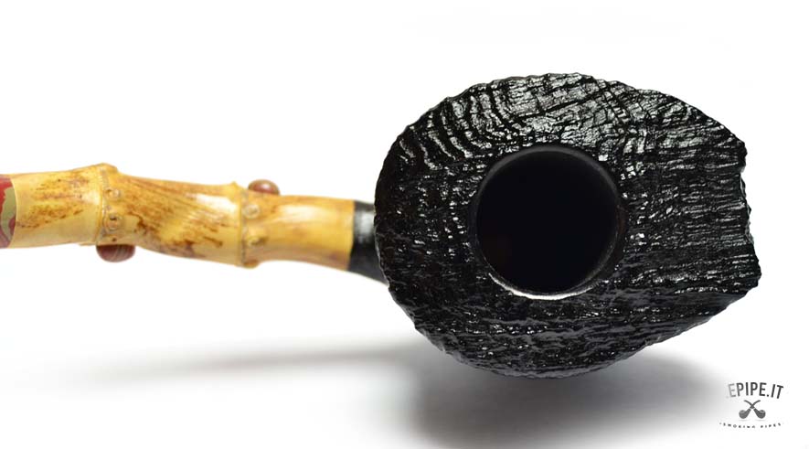 Il cannello in bamboo è un elemento distintivo che aggiunge leggerezza ed eleganza alla composizione, creando un affascinante contrasto tra il calore del legno naturale e la robustezza della radica sabbiata. Le sue sezioni nodose, impreziosite da dettagli naturali, conferiscono alla pipa un'estetica organica e armoniosa.