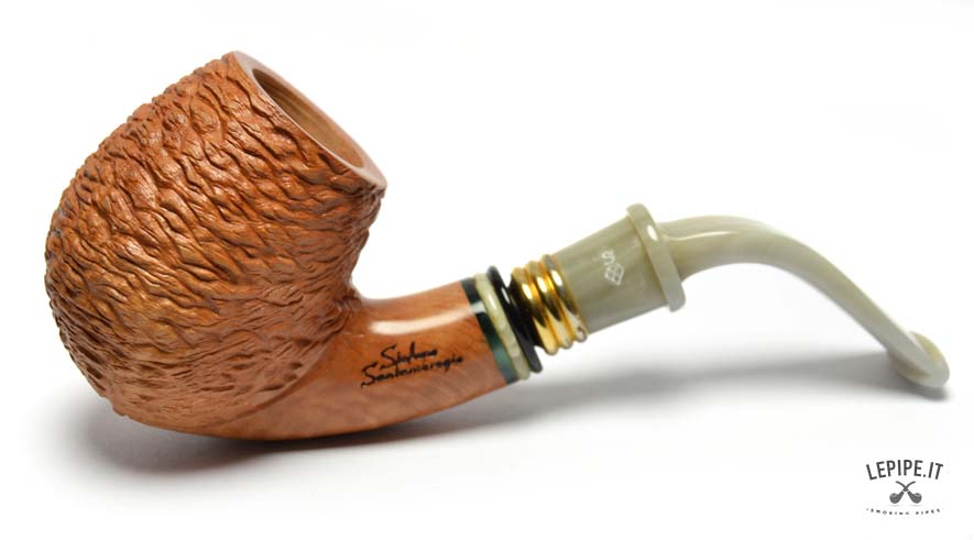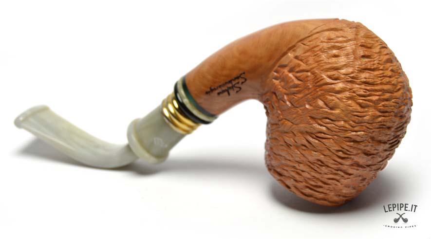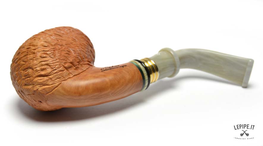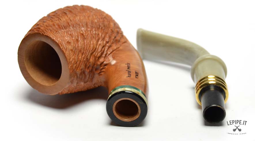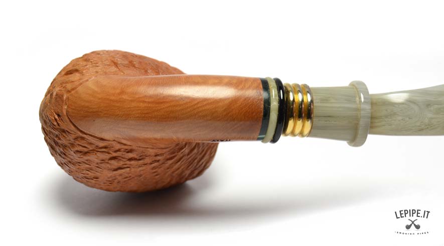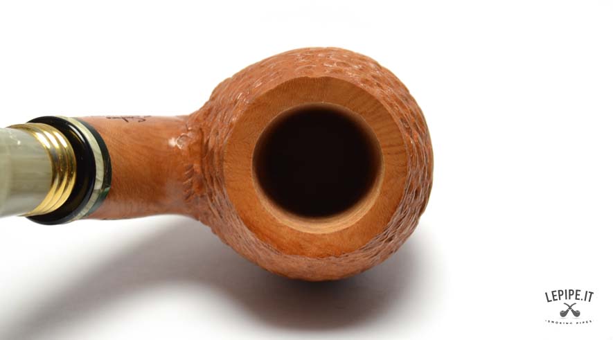 La finitura rusticata naturale conferisce alla pipa un aspetto distintivo, esaltando la venatura della radica e migliorando la presa. Il cannello liscio crea un contrasto elegante con il fornello, mettendo in evidenza la qualità della lavorazione.