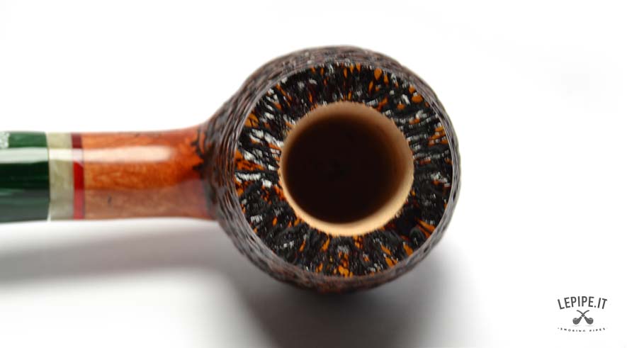 La finitura rusticata scura e profonda crea un contrasto spettacolare con il cannello liscio, esaltando le venature naturali della radica. Questo particolare trattamento non solo conferisce un’estetica unica, ma migliora anche la dispersione del calore.