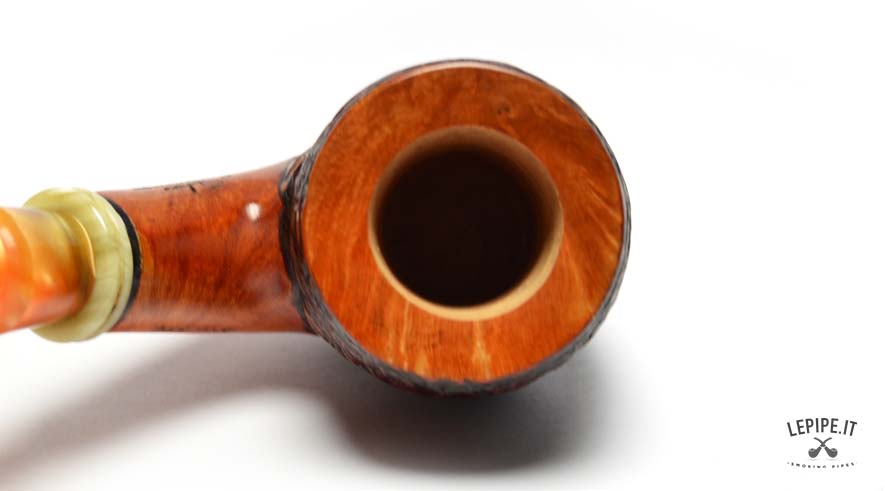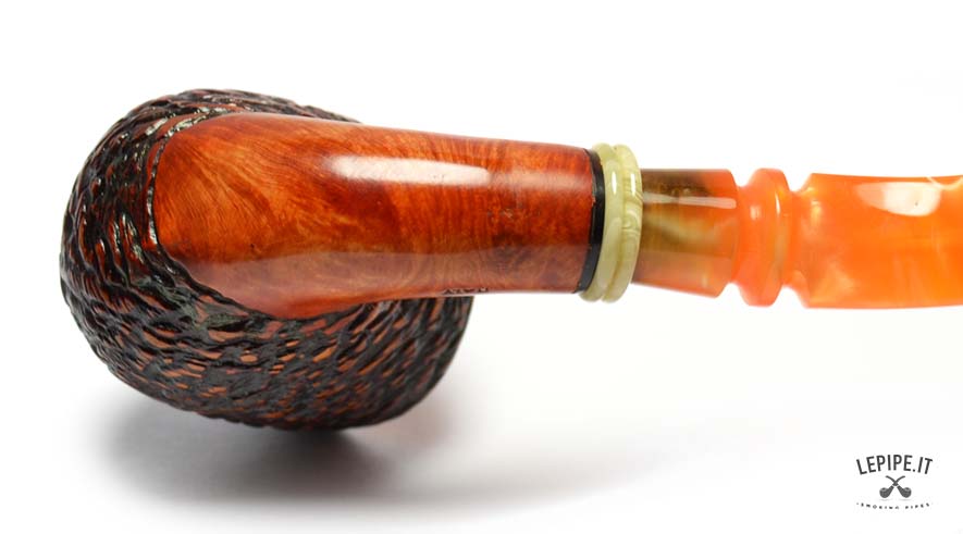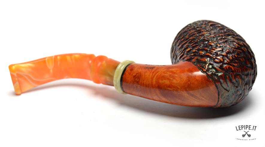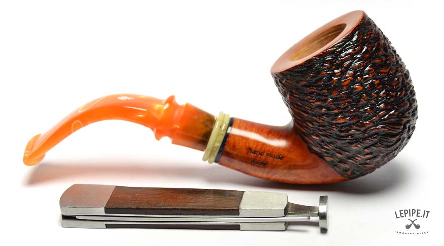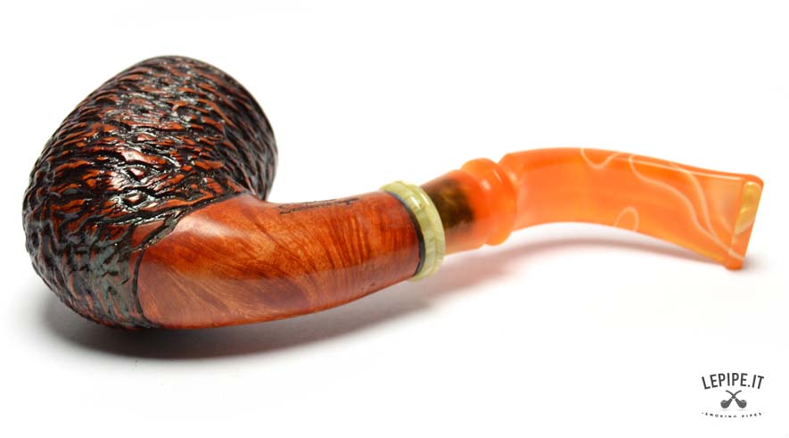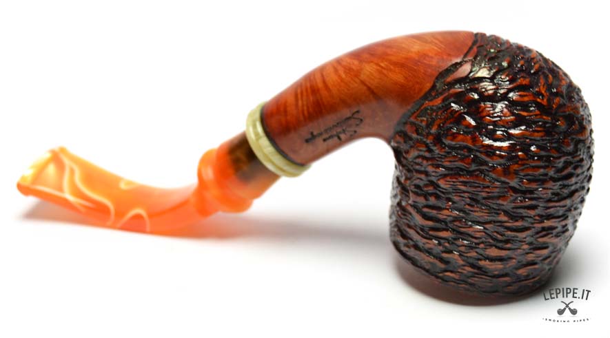 Realizzata a mano da Stefano Santambrogio, questa pipa Bent Billiard presenta una finitura rustica che dona alla radica una texture unica e distintiva. Il bocchino in acrilico arancione, abbinato a un elegante anello in materiale composito, completa il design, mentre la sede per filtro da 9 mm offre la possibilità di personalizzare l'esperienza di fumata.