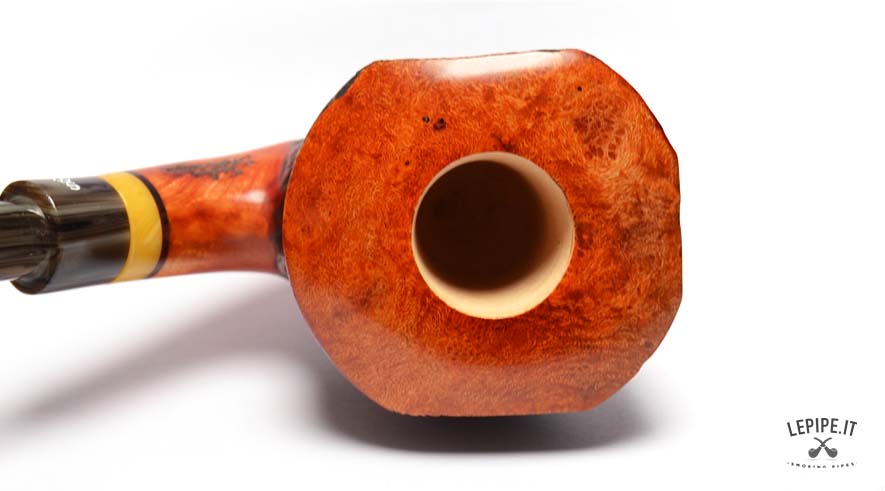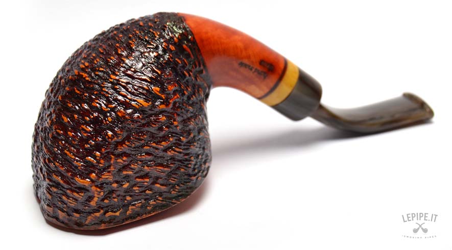 Con una forma Freeform e una finitura rustica, questa pipa esprime la maestria di Stefano Santambrogio nel creare pezzi unici. Il bocchino in metacrilato scuro, arricchito da un elegante anello in materiale composito, completa il design, mentre la pipa è priva di filtro per un'esperienza di fumata più naturale e diretta.