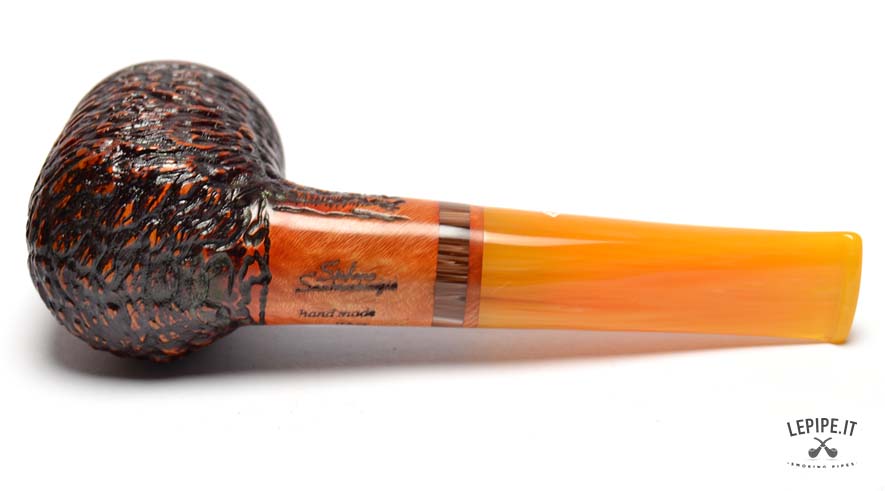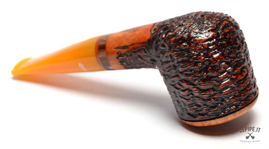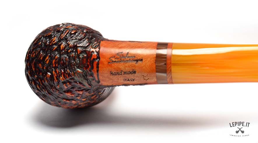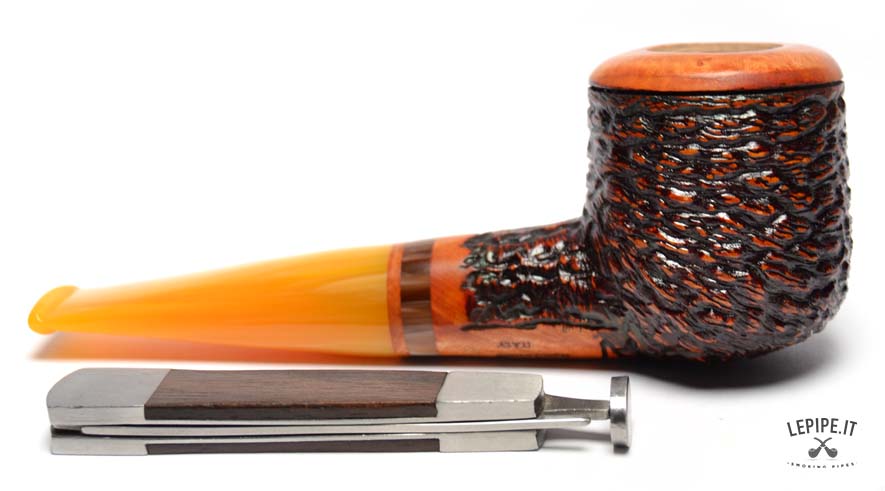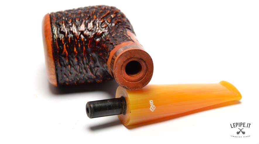 Questa pipa è realizzata da Stefano Santambrogio e presenta una forma Billiard con una finitura rustica che dona alla radica una texture profonda e distintiva. Il bocchino in metacrilato arancione, combinato con un elegante anello in materiale composito, aggiunge un tocco di colore e raffinatezza al design. La pipa è priva di filtro, per una fumata più naturale e diretta.