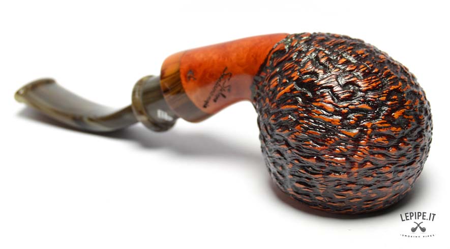 Realizzata da Stefano Santambrogio, questa pipa di forma Bent Pot si distingue per la finitura rustica che conferisce alla radica una texture profonda. Il bocchino in metacrilato grigio, insieme all'anello in materiale composito, arricchisce il design elegante e sofisticato. Essendo priva di filtro, offre una fumata più naturale e diretta.