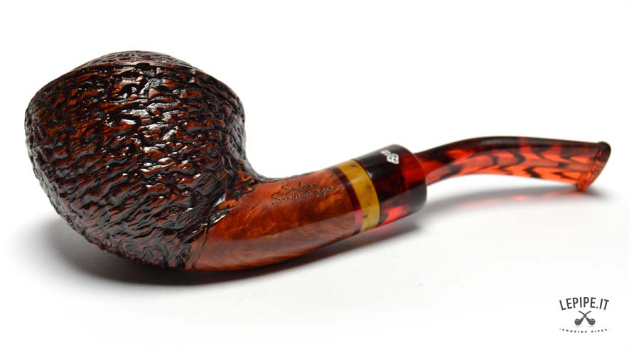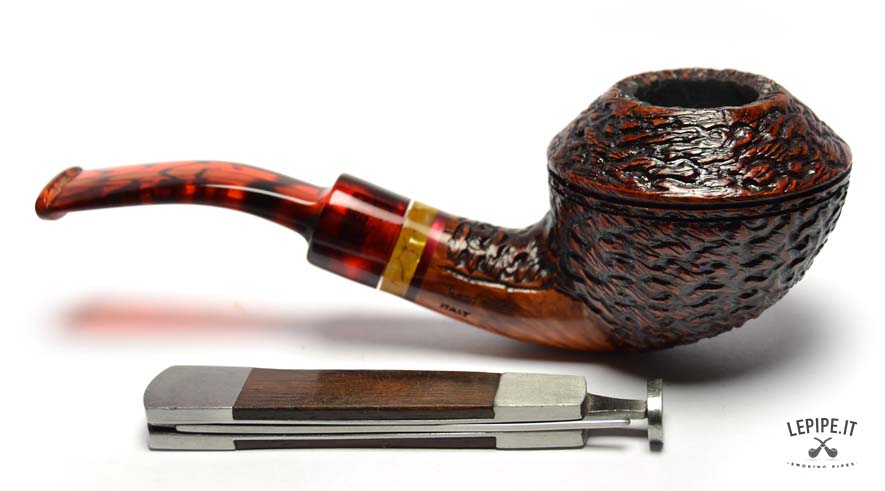 Questa pipa è realizzata da Stefano Santambrogio e presenta una forma Rhodesian con una finitura rustica che dona alla radica una texture marcata e distintiva. Il bocchino in metacrilato rosso, abbinato all'anello in materiale composito, aggiunge un elegante contrasto al design complessivo. La pipa è priva di filtro, per una fumata più naturale e diretta.