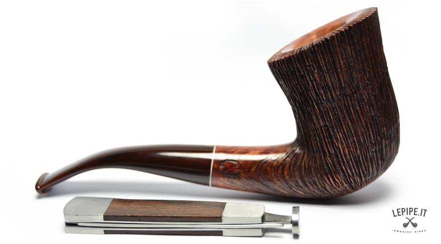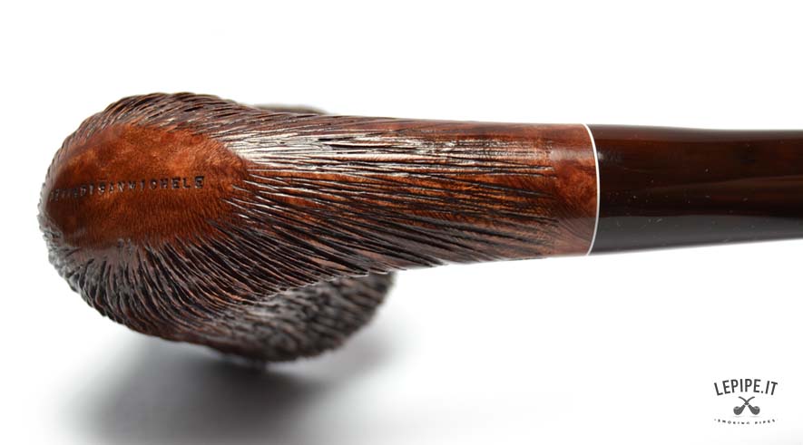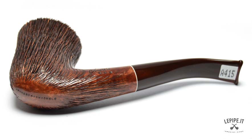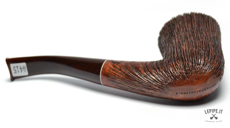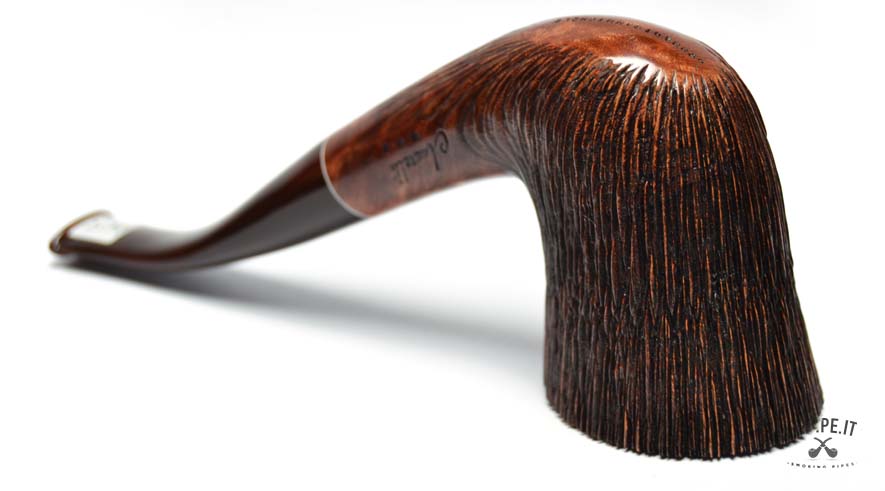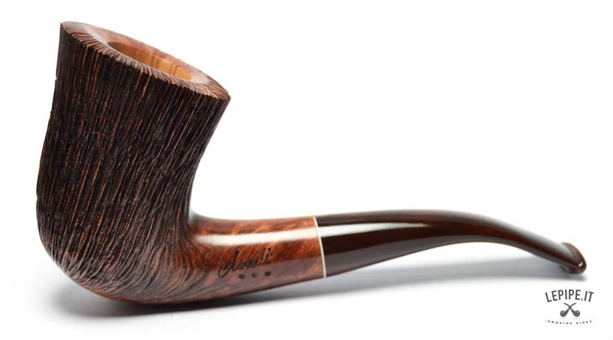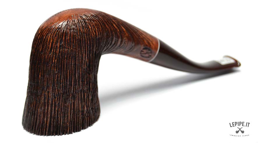 Con la sua forma Bent Dublin, questa pipa della serie Penna di San Michele di Amorelli è caratterizzata da una curva morbida e un fornello ampio, che offre una fumata piacevolmente lunga e rilassante. La finitura rustica, che esalta il lato più naturale e resistente della radica, conferisce un aspetto solido e distintivo. L'artigiano ha lavorato con attenzione per esaltare la trama naturale della radica, creandone una superficie che inviti al tatto.