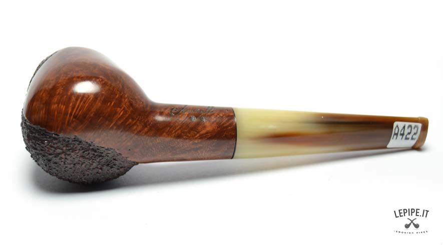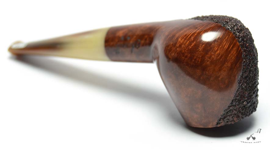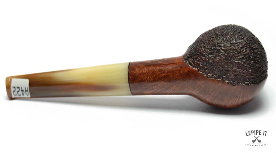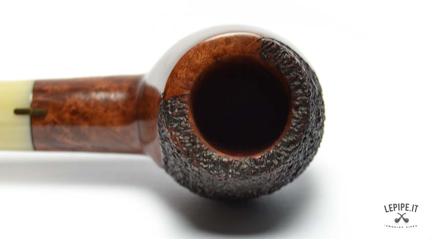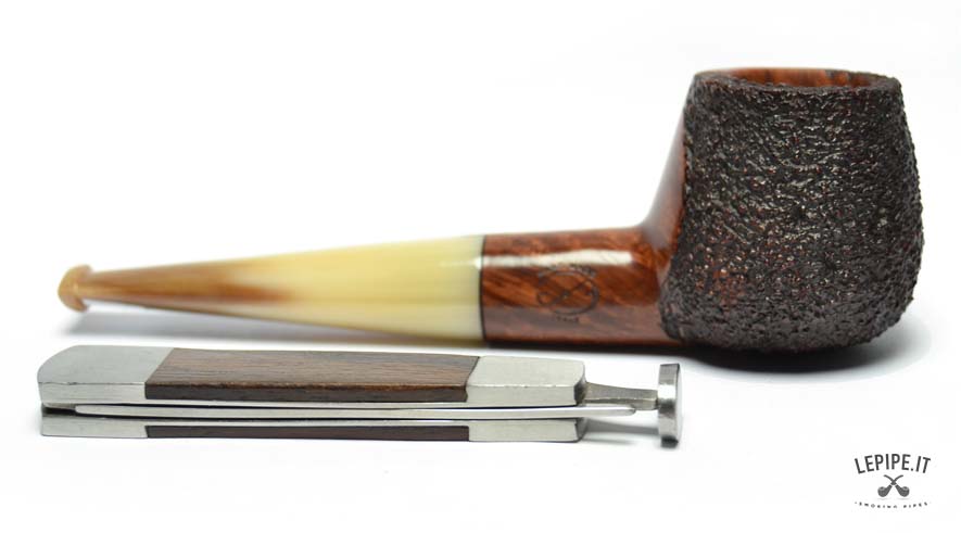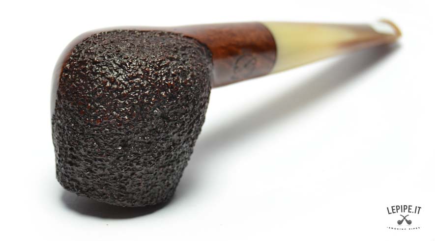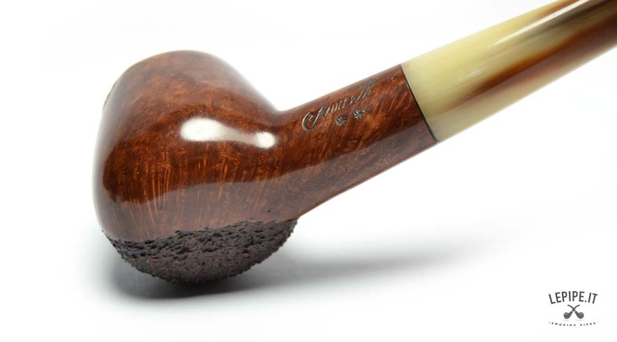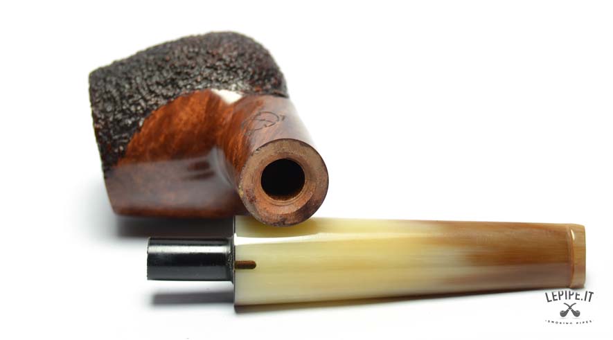 Il bocchino in metacrilato effetto corno aggiunge un tocco di eleganza e unicità, armonizzandosi con le tonalità calde della radica. La forma Stand-Up permette di appoggiare la pipa in verticale senza supporto, un dettaglio pratico per ogni fumatore.