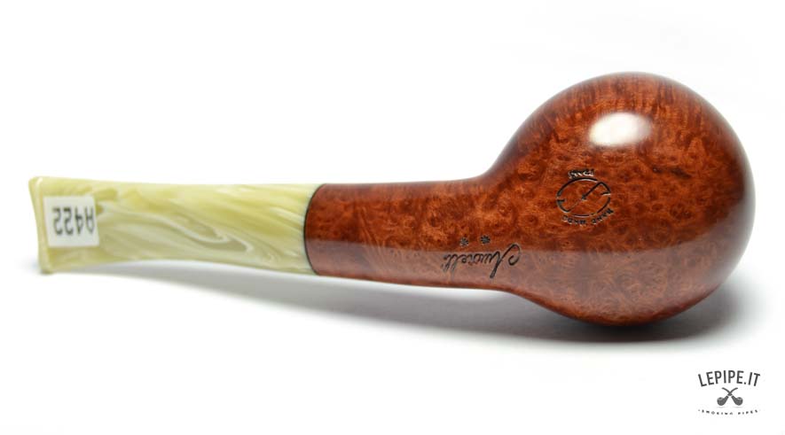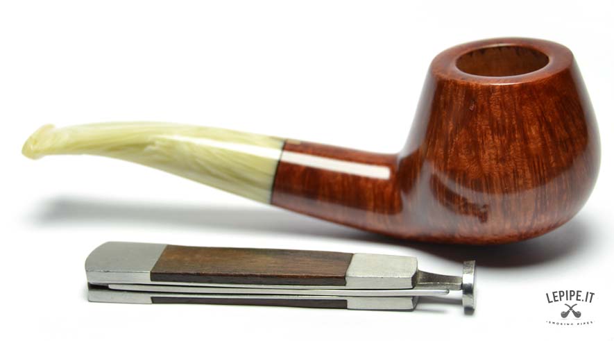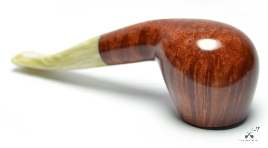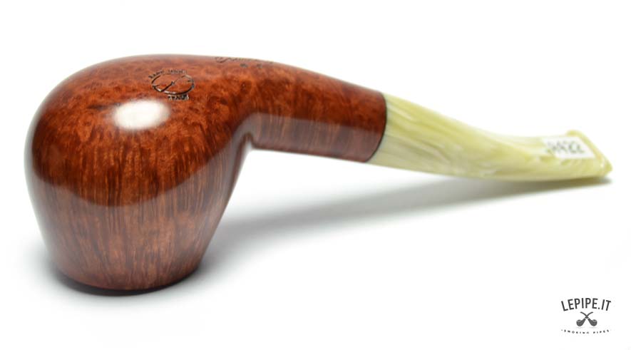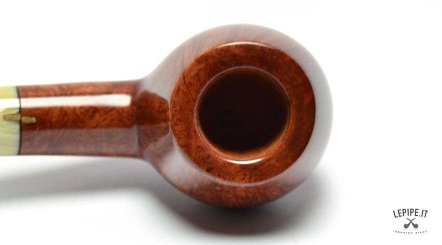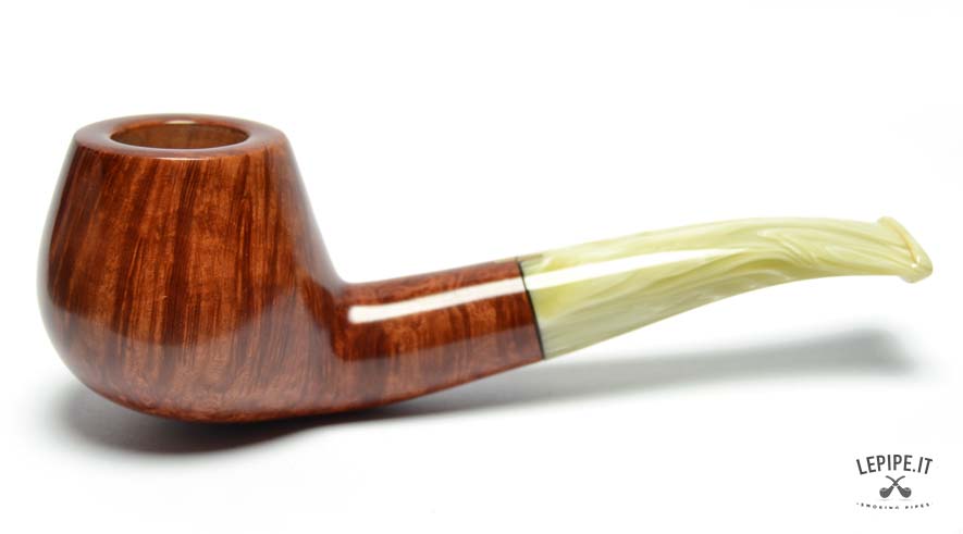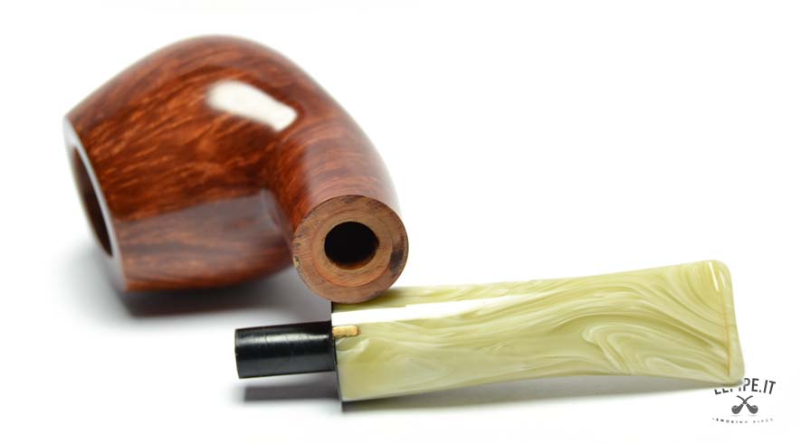 Il bocchino in metacrilato marezzato, con sfumature avorio e crema, aggiunge un tocco di unicità e si integra armoniosamente con il design della pipa. La curvatura leggera garantisce un'ottima ergonomia, rendendo la fumata ancora più piacevole e rilassata.