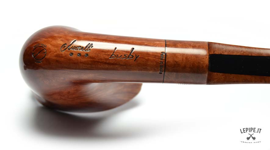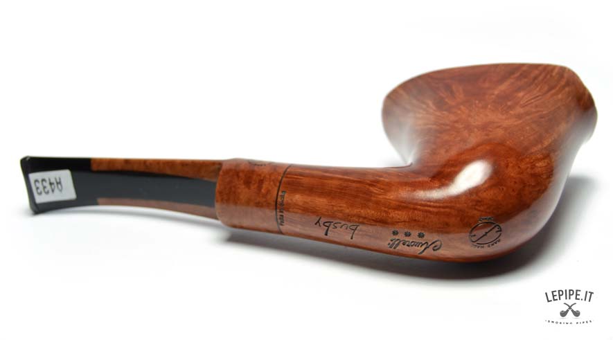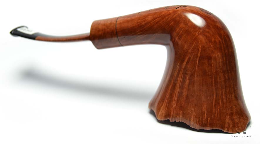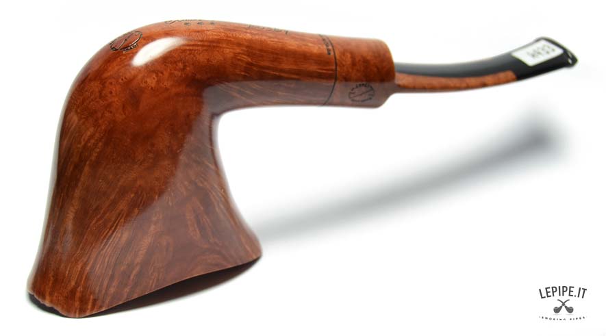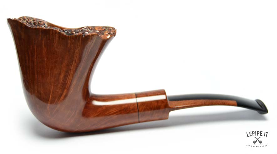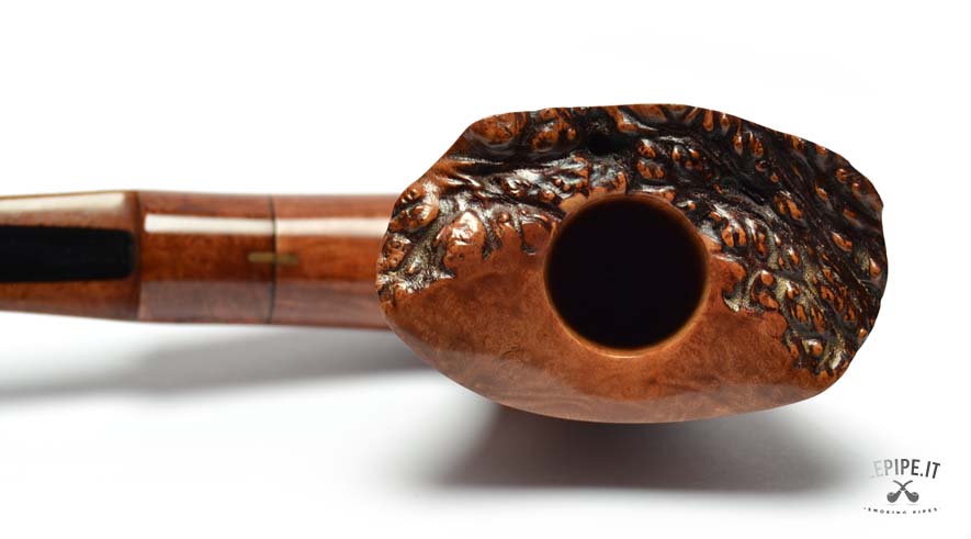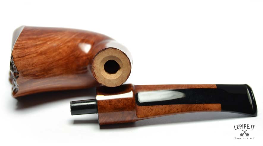 La finitura liscia e lucida esalta la profondità e la complessità delle venature della radica, donando a questa pipa una presenza scenica straordinaria. Il bocchino in acrilico nero, leggermente curvato, garantisce un'ergonomia eccellente, bilanciando il peso della struttura per una fumata confortevole.
