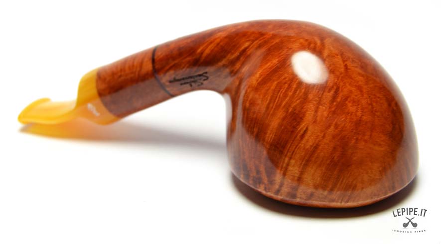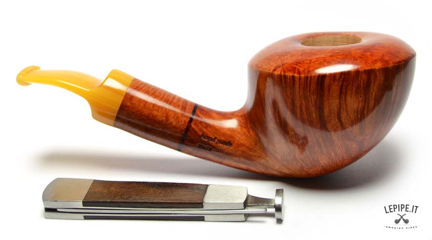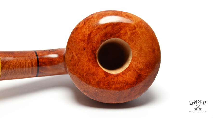Il fornello, ampio e imponente, presenta pareti spesse e una base larga, scolpito in una bellissima radica fiammata rifinita con una lucidatura brillante che mette in risalto le venature calde e dinamiche del legno. Una presenza importante, pensata per offrire una fumata lunga e appagante.
