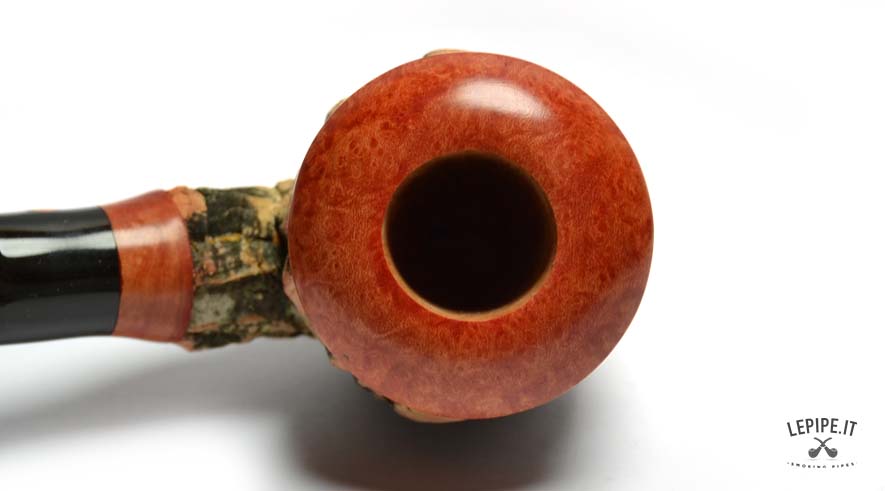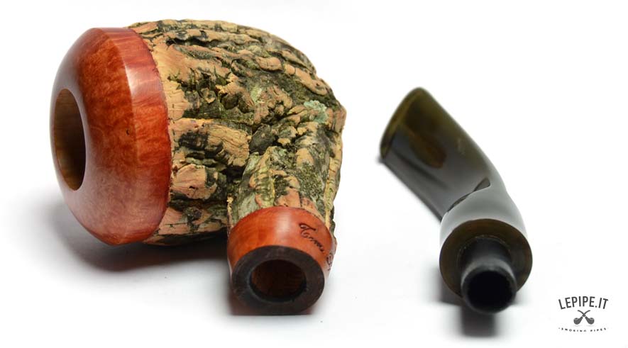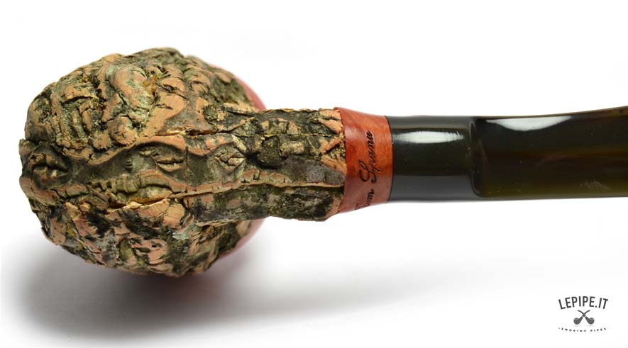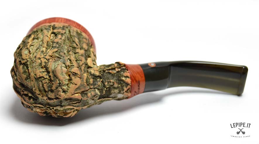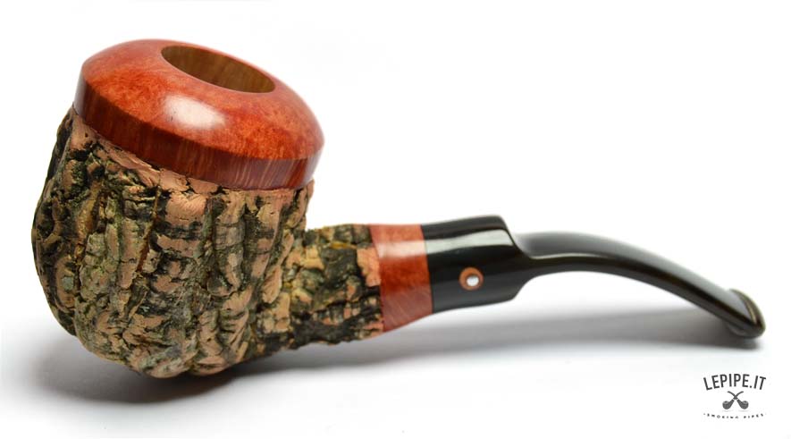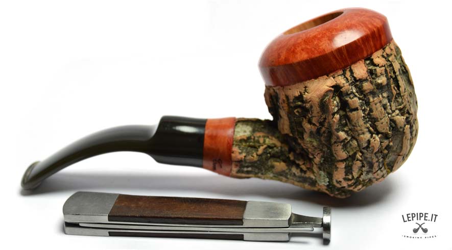 Questa pipa Spanu nella raffinata forma Bent Billiard, con base Stand-Up, è una fusione perfetta tra funzionalità, estetica e tradizione. Realizzata in pregiata radica italiana e rivestita in autentico sughero sardo, si distingue per il suo aspetto materico e naturale, che richiama la corteccia degli alberi mediterranei. Il sughero non è solo un elemento distintivo di design, ma anche un materiale funzionale: grazie alle sue proprietà isolanti, evita che la pipa scotti tra le mani, rendendo l’esperienza ancora più piacevole. Le porzioni di radica lasciate a vista, levigate con cura sulla parte superiore del fornello e lungo il raccordo con il bocchino, creano un elegante contrasto con la texture rustica del sughero. Il bocchino in acrilico nero curvo si innesta armoniosamente nel design e accoglie un filtro da 9 mm, garantendo una fumata dolce e fresca. La base piatta permette alla pipa di restare in piedi da sola, rendendola non solo funzionale ma anche perfetta per l’esposizione. Un pezzo autentico e ricco di carattere, che racconta la Sardegna e la grande tradizione artigianale italiana.