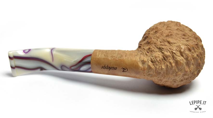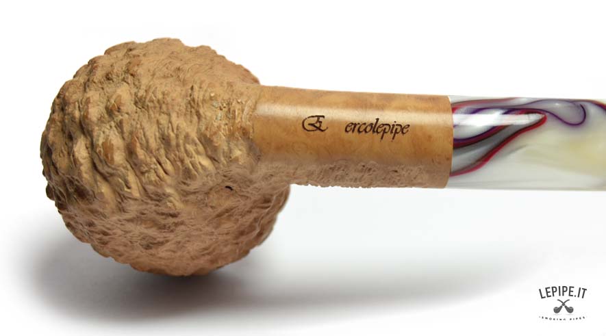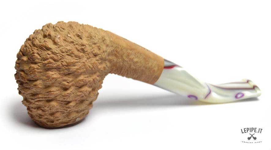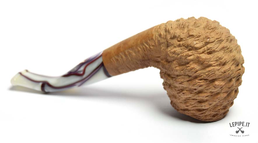 Una pipa che colpisce al primo sguardo per il suo carattere audace e la forte personalità. Questo pezzo firmato Ercole Bogni presenta una forma Bent Apple, compatta ma slanciata, con una testa generosa alta 48 mm, scolpita in radica grezza con una rusticatura profonda e materica che richiama texture naturali, quasi scultoree. Il contrasto con il bocchino in metacrilato è sorprendente: un vortice di colori chiari e venature porpora che dona vivacità e modernità all’insieme, pur mantenendo l’eleganza tipica della manifattura Bogni. Con un peso di 61 grammi, la pipa è ben bilanciata in mano e invita a una fumata rilassata e ricca di stile. Un esemplare che unisce tradizione artigianale e spirito contemporaneo, perfetto per chi cerca qualcosa di originale senza rinunciare alla qualità.