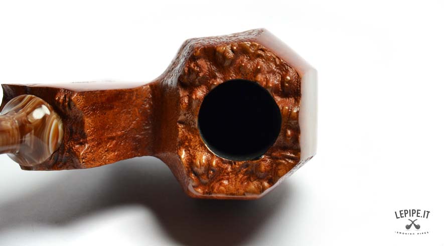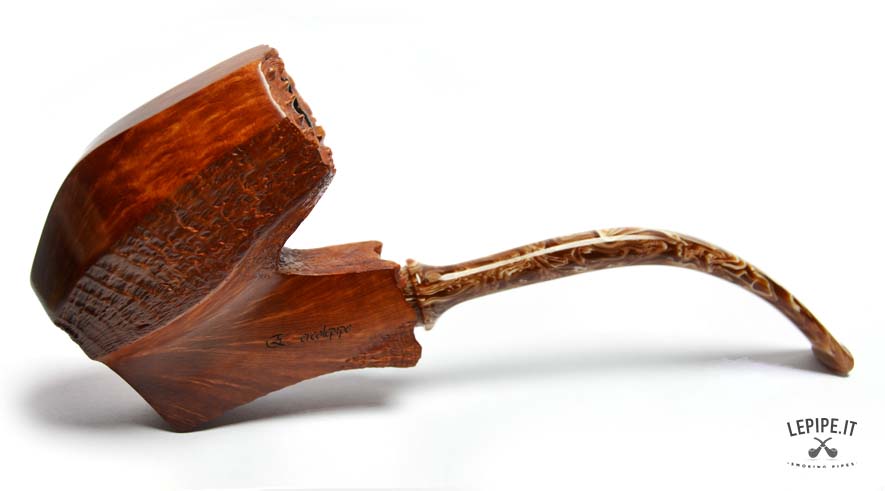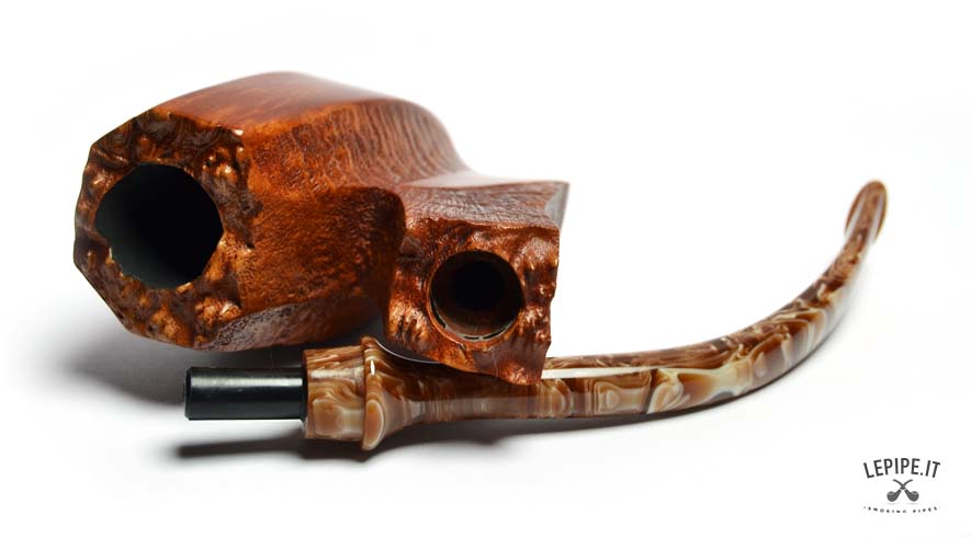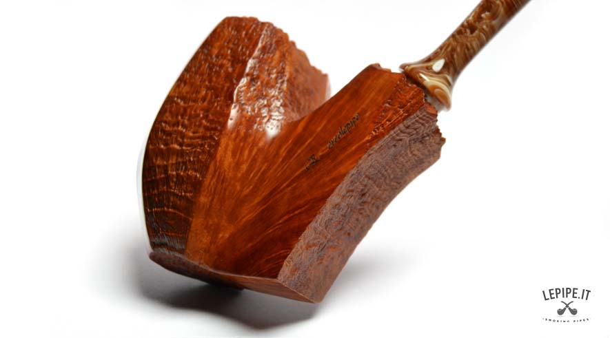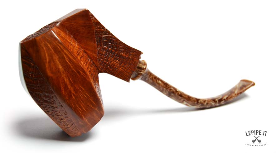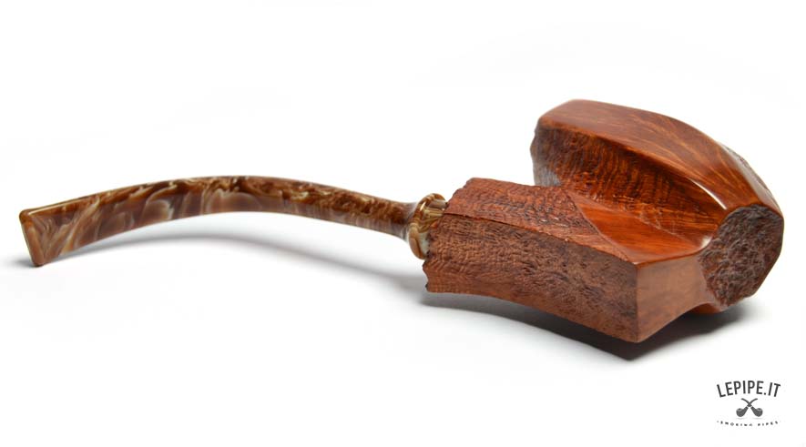 Audace e sorprendente, questa pipa Panel Stand-Up di Ercole Bogni è una vera scultura da tenere in mano. Il design geometrico e angolare si sviluppa con precisione in superfici piane e spigoli netti, interrotti da dettagli rusticati che donano profondità e carattere alla radica. La parte superiore del fornello conserva la corteccia originale, creando un contrasto materico e visivo con la finitura liscia e lucida delle pareti laterali. Il bocchino, in acrilico con tonalità calde e venature avvolgenti, accompagna la linea con eleganza e unicità. Il profilo arcuato e la base piatta la rendono perfetta per stare in piedi da sola, aggiungendo funzionalità a una pipa che già si distingue per stile e personalità. Un pezzo per veri intenditori, capace di coniugare arte e utilizzo quotidiano.
