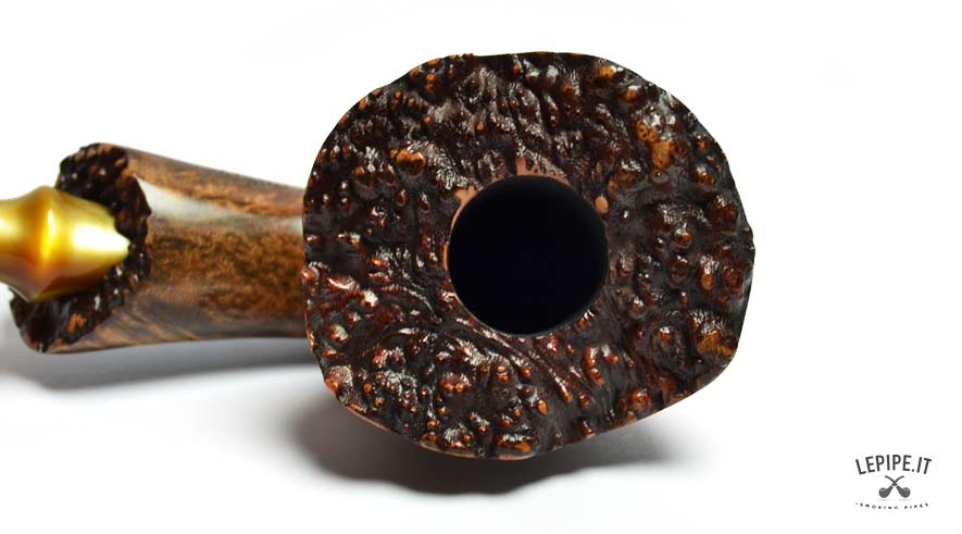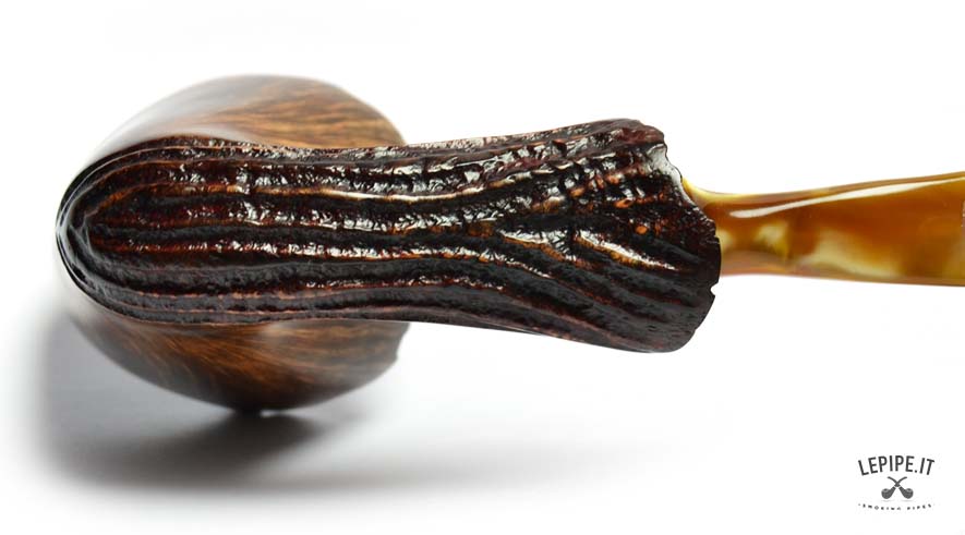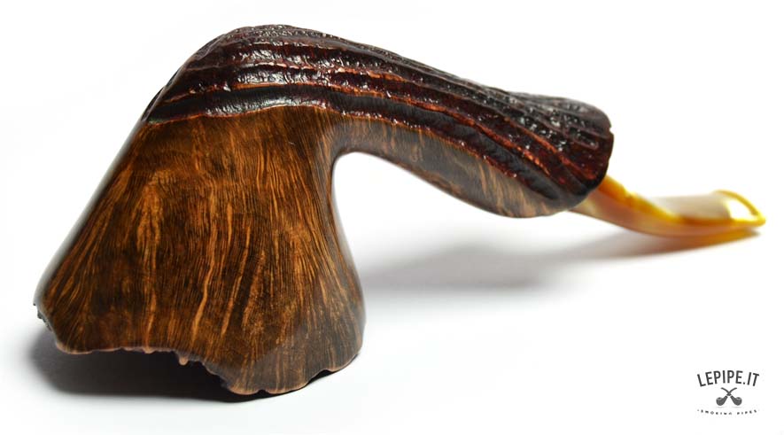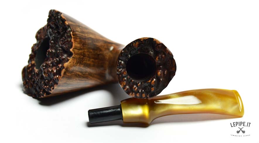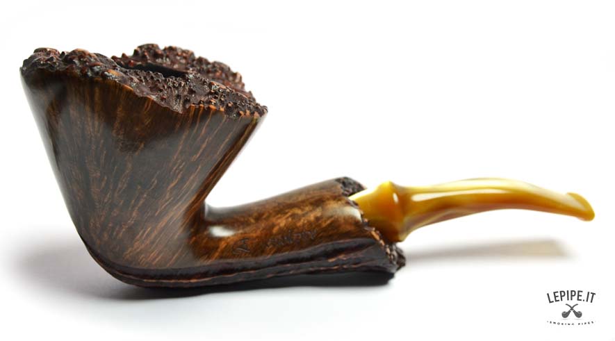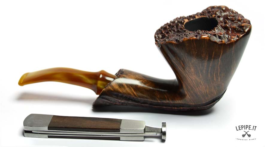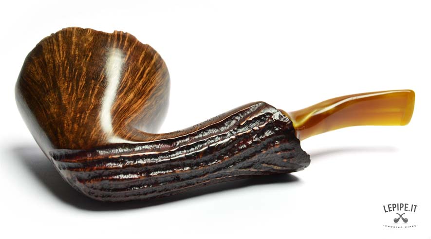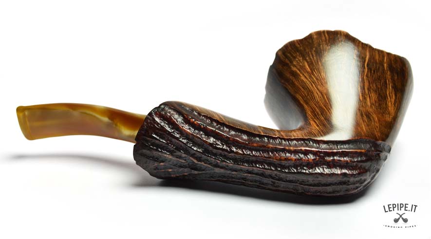 Con un design che sfida ogni convenzione, questa pipa Freeform di Ercole Bogni si distingue per la forza espressiva e la straordinaria cura artigianale. Il fornello, con un generoso diametro interno di 25 mm e un esterno di 52 mm, è scolpito per valorizzare le splendide fiammature della radica, messe in risalto da una finitura lucida che ne amplifica la profondità visiva. La parte inferiore e il cannello presentano una rusticatura profonda a scanalature, creando un dinamico contrasto tattile e cromatico con la parte liscia e levigata. Il bordo superiore conserva la corteccia naturale, esaltando l’autenticità del materiale. Il bocchino in acrilico color miele completa l’insieme con una nota calda e armoniosa. Un pezzo unico, pensato per il collezionista che cerca estetica, equilibrio e un’interpretazione personale della forma libera.