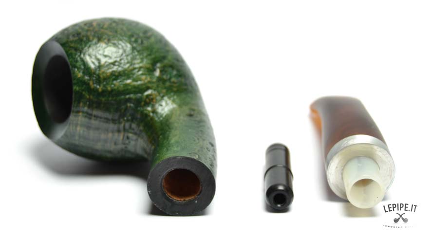 Il bocchino curvo in acrilico effetto ambra, con innesto per filtro da 9 mm, si integra perfettamente nel design grazie anche alla ghiera in metallo satinato, che aggiunge solidità all’assemblaggio e un tocco sobrio. Il peso ben distribuito e le dimensioni contenute la rendono una pipa maneggevole e piacevole all’uso.