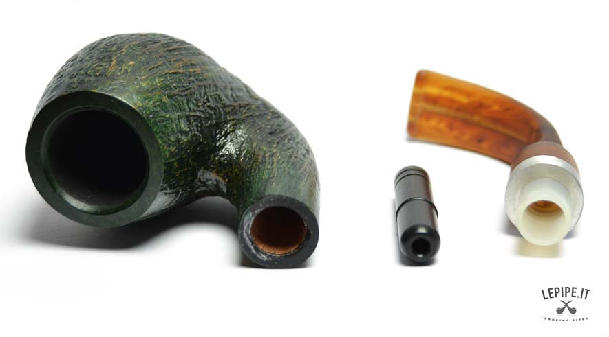 Il bocchino in acrilico effetto ambra è arcuato con innesto a filtro 9 mm, come da consuetudine Vauen. La ghiera in metallo satinato rafforza il raccordo tra cannello e bocchino, aggiungendo un dettaglio visivo discreto e funzionale. La curvatura netta del profilo aiuta a bilanciare il peso, rendendo questa pipa confortevole da tenere anche in bocca.