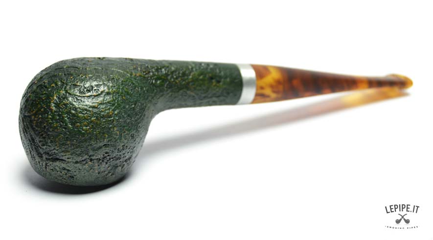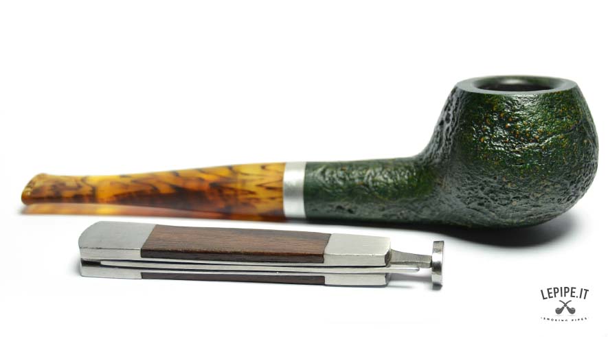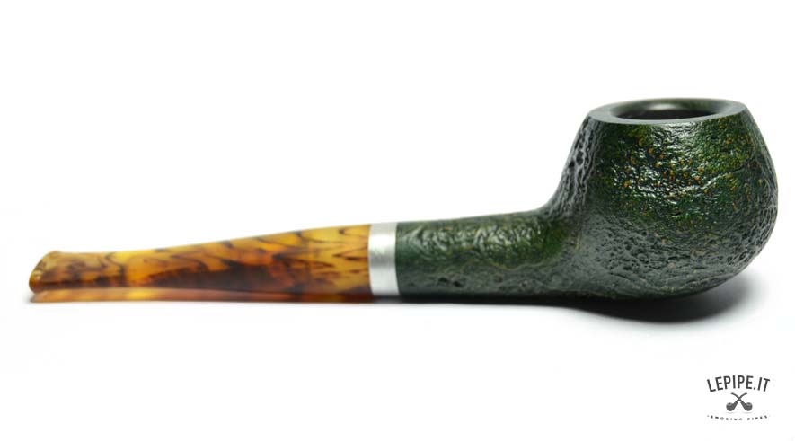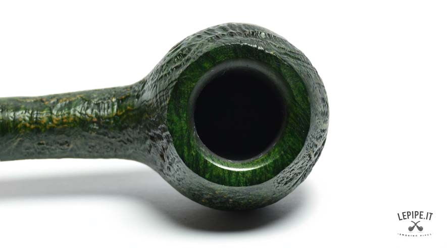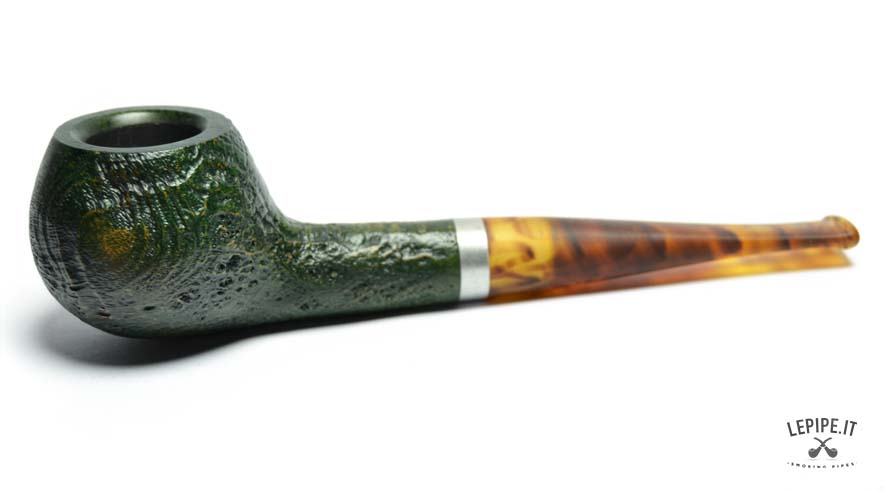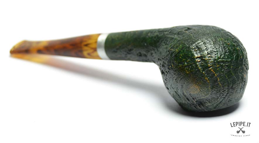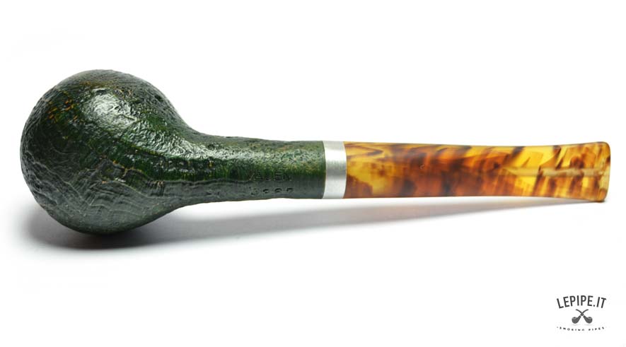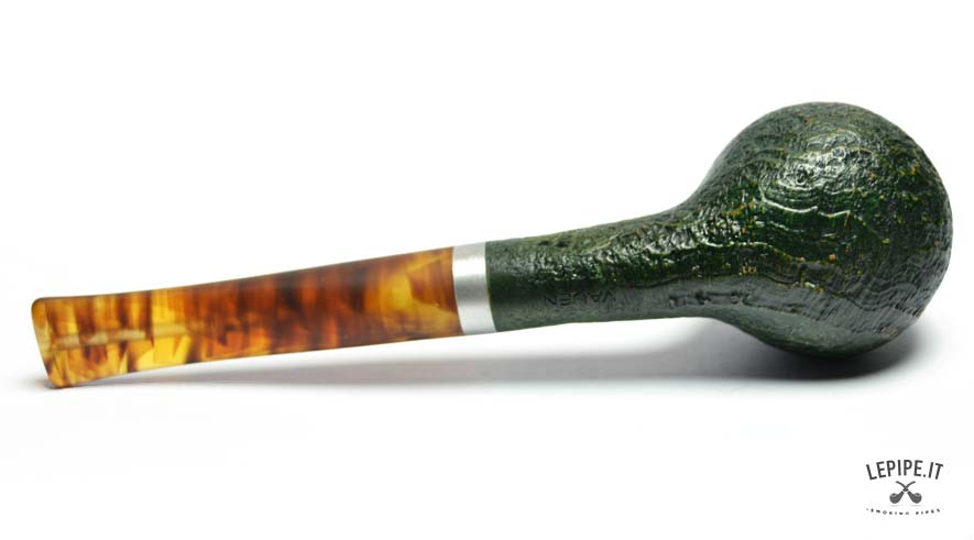 La pipa Vauen Ranger modello 4367 è realizzata in radica sabbiata con finitura verde scura, che evidenzia la naturale venatura del legno e conferisce alla superficie una texture ruvida ma elegante. La forma Apple, classica e compatta, è qui declinata in versione stand-up, ovvero con base piatta che consente alla pipa di restare in piedi da sola, pratica per l’appoggio durante l’uso.