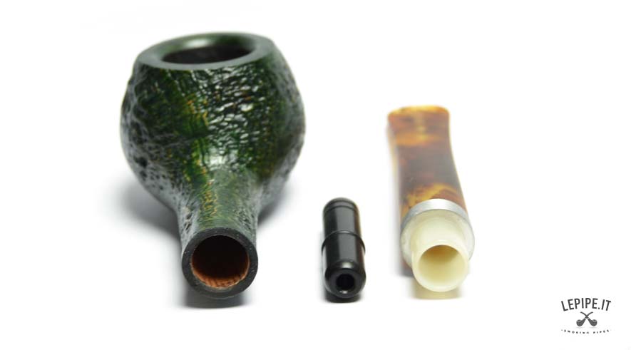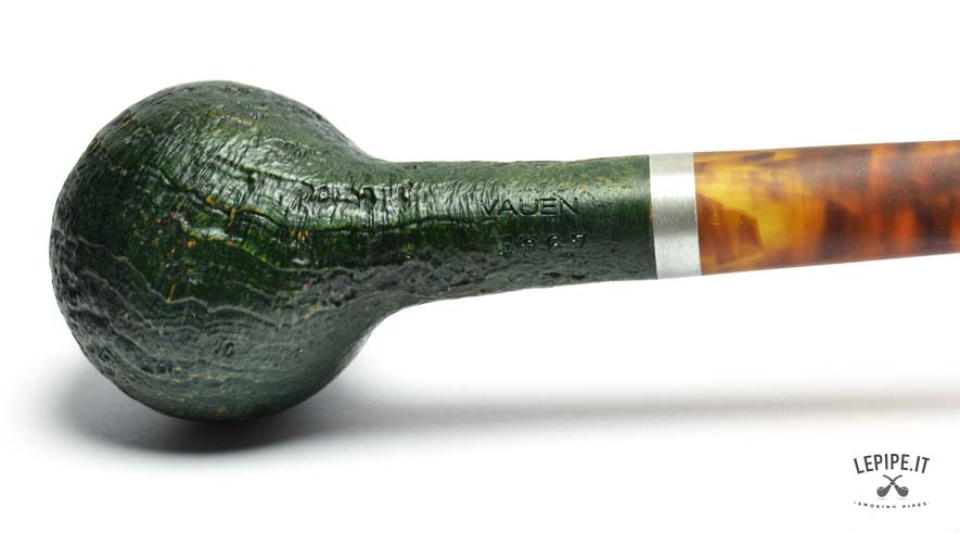 Il bocchino in acrilico effetto ambra è diritto, con innesto a 9 mm per filtro, come da tradizione Vauen. Il raccordo è impreziosito da una ghiera in metallo satinato che migliora la tenuta e dona un tocco moderno all’insieme. L’equilibrio tra forma, materiali e finitura offre una fumata stabile, con una buona ergonomia e facilità di manutenzione.