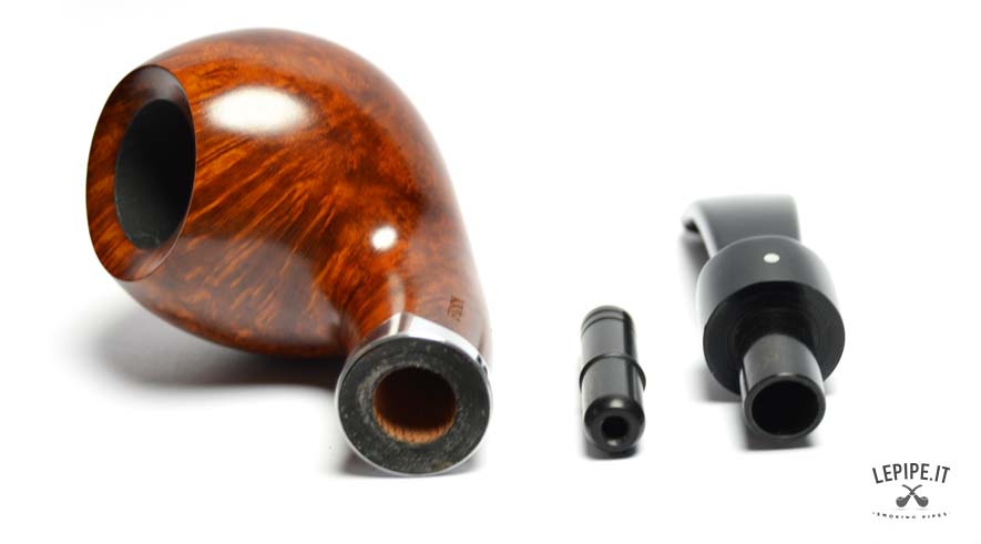 Il bocchino curvo in acrilico nero è predisposto per filtro da 9 mm, secondo lo standard Vauen. Il raccordo è impreziosito da una ghiera in metallo lucido che rafforza la struttura e aggiunge un dettaglio discreto ma raffinato. Il profilo dolcemente curvo facilita la presa e l'equilibrio durante l’uso.