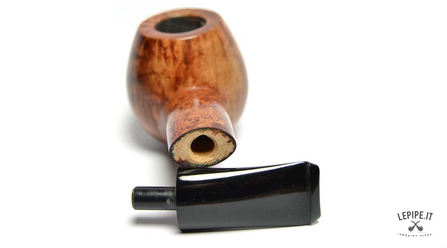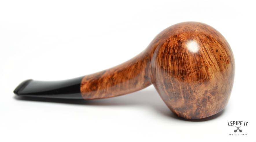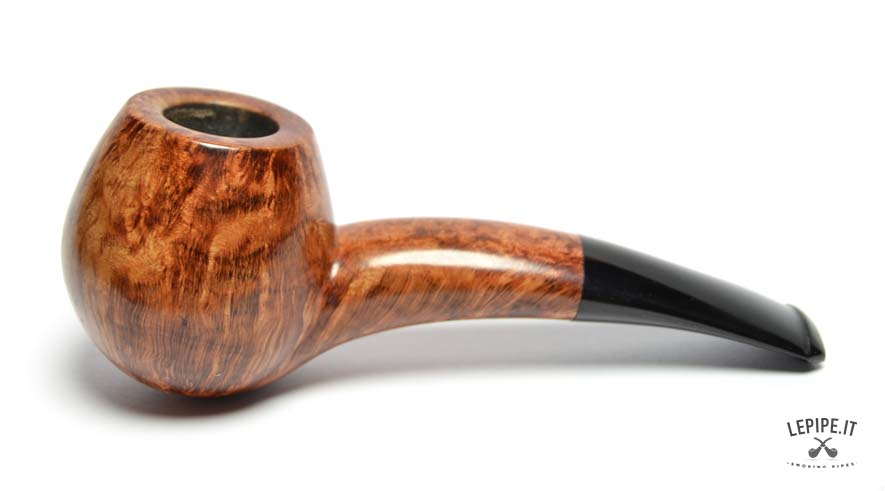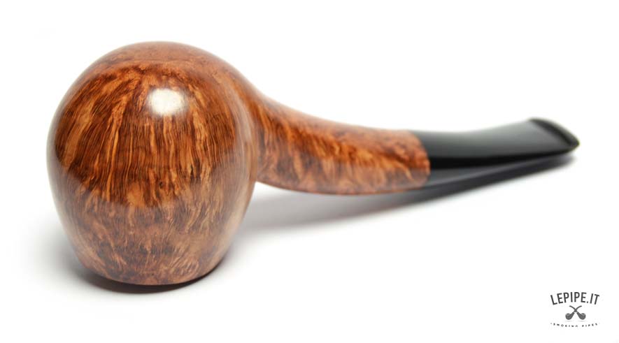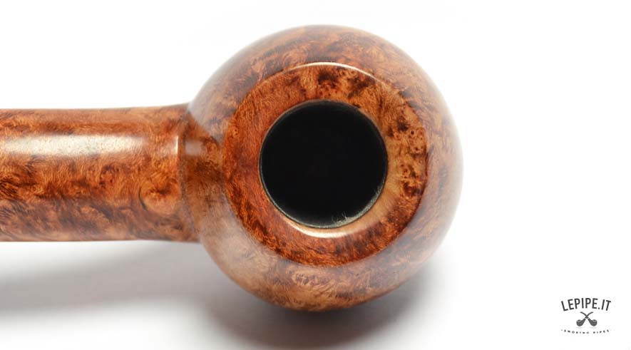 Realizzata in radica italiana liscia con finitura calda e luminosa, questa pipa presenta venature ricche esaltate dalla superficie levigata. Il bocchino in ebanite, leggermente curvo e perfettamente raccordato, assicura una sensazione morbida e piacevole durante l’uso prolungato.