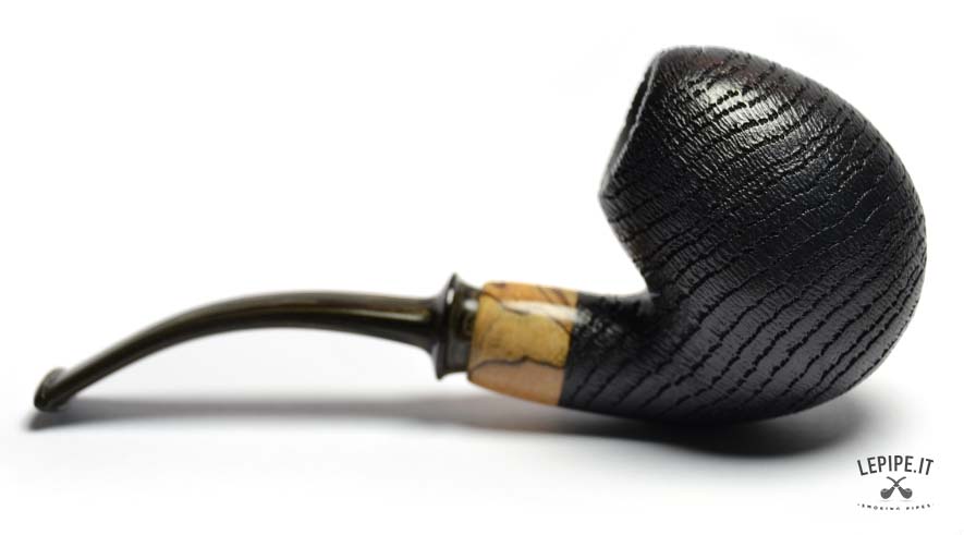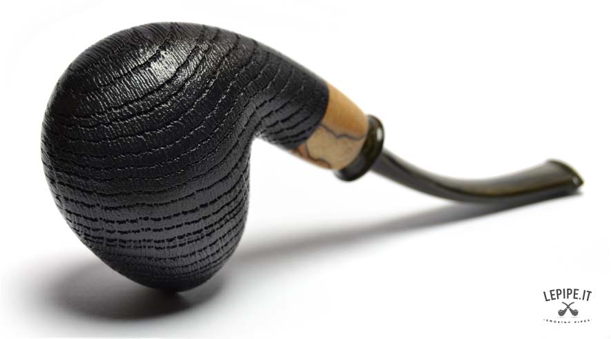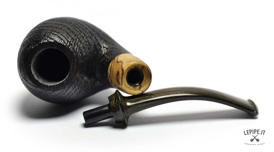 Una pipa che unisce fascino arcaico e raffinatezza contemporanea: questa creazione firmata La Biota è realizzata in autentico legno di morta, un materiale fossile di straordinario pregio, estratto da antichi giacimenti sommersi e lavorato con cura maniacale. La forma Bent Egg, morbida e avvolgente, accoglie il palmo con naturalezza, mentre la superficie finemente sabbiata valorizza le onde scure e compatte del legno, creando un pattern unico e profondamente materico. Il raccordo in legno chiaro, venato e satinato, introduce un contrasto cromatico ricercato, che accompagna con armonia il bocchino curvo in tonalità bruna. Ogni dettaglio esprime l’equilibrio perfetto tra potenza organica e controllo formale, in una pipa che racconta una storia lunga secoli e un’estetica profondamente contemporanea.