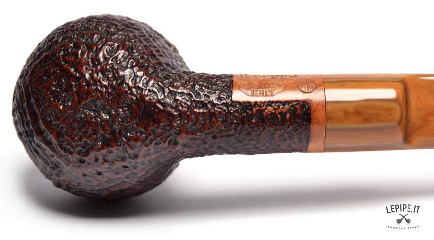 Pipa Il Ceppo - Sabbiata n. 83  Bocchino in metacrilato Con sede per filtro da 9 mm. Sabbiata Senza elaborazione Diametro Interno: 20 mm. Diametro Esterno: 43 mm. Lunghezza: 142 mm. Altezza: 35 mm. Peso: 46 gr. Profondità: 26 mm.