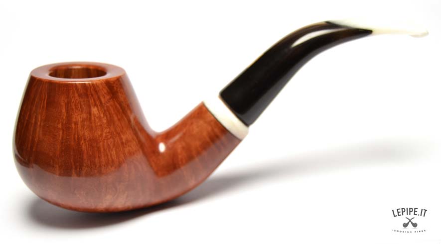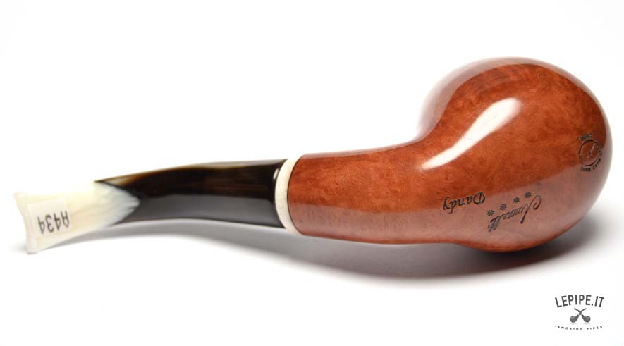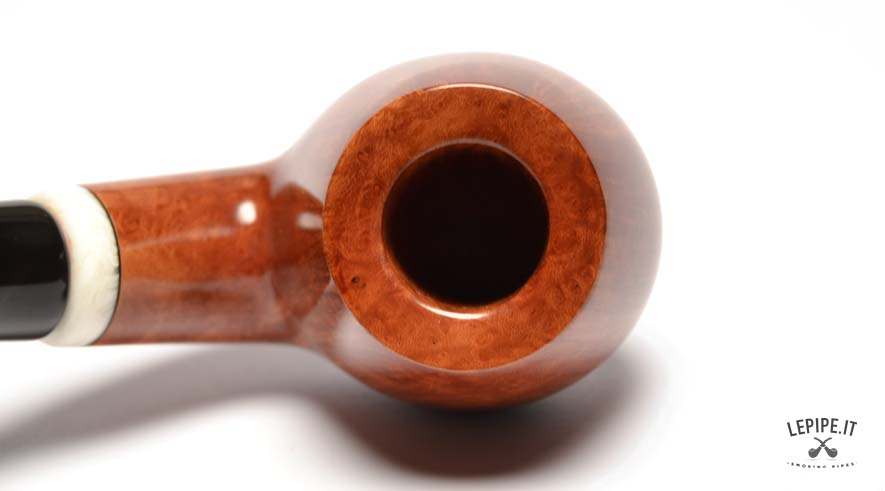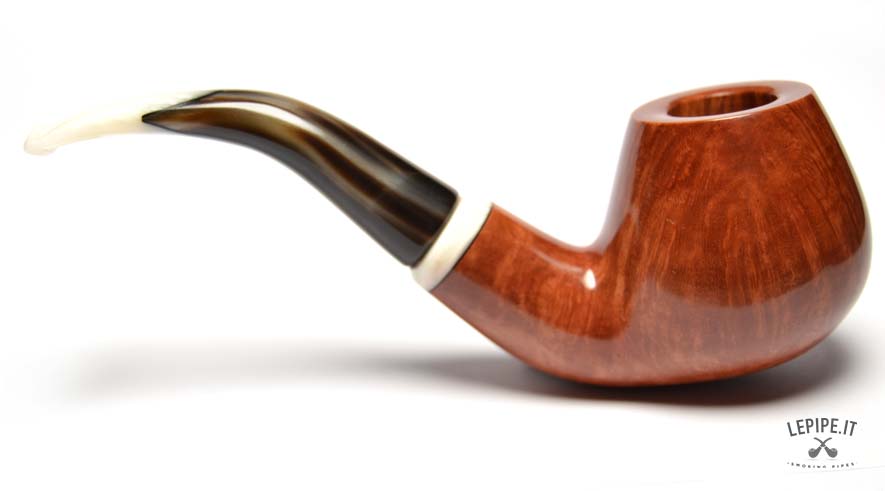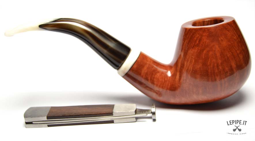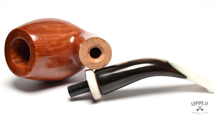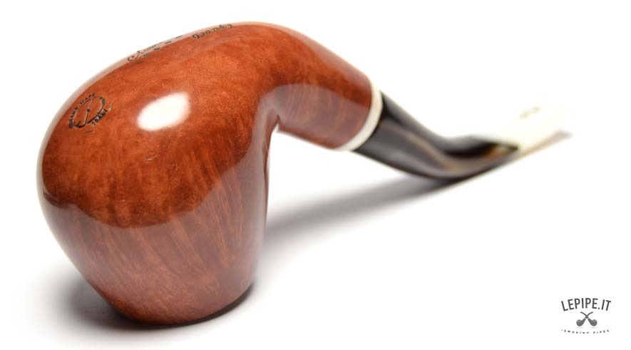 La Amorelli - 4 Stelle n. 40 si distingue per la sua forma Bent Brandy e l’elaborazione Dandy, che le conferisce un’eleganza senza tempo. La lavorazione Dandy è un omaggio allo stile classico, ma con un tocco di originalità che riflette l’estro artistico di Amorelli. Il bocchino in corno aggiunge un ulteriore livello di raffinatezza, non solo visivamente, ma anche in termini di comfort durante la fumata. Il fornello, con un diametro interno di 21 mm e un’altezza di 53 mm, offre una capacità ideale per chi desidera lunghe sessioni di fumata senza compromettere la qualità. La lunghezza di 163 mm assicura che il fumo si raffreddi in maniera ottimale, garantendo una fumata uniforme e piacevole dall’inizio alla fine. La finitura liscia esalta le venature naturali della radica, rendendo questa pipa un vero capolavoro di artigianato. Con un prezzo di 361,00 €, la Amorelli - 4 Stelle n. 40 rappresenta una scelta perfetta per i fumatori più esigenti, alla ricerca di una pipa che combini funzionalità, stile e una lavorazione artigianale impeccabile. Un pezzo unico che esprime appieno l’essenza dell’arte di Amorelli.