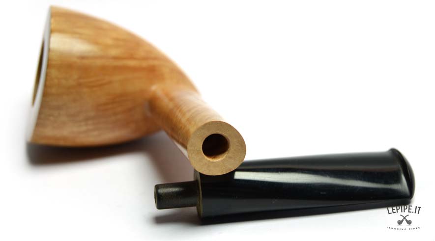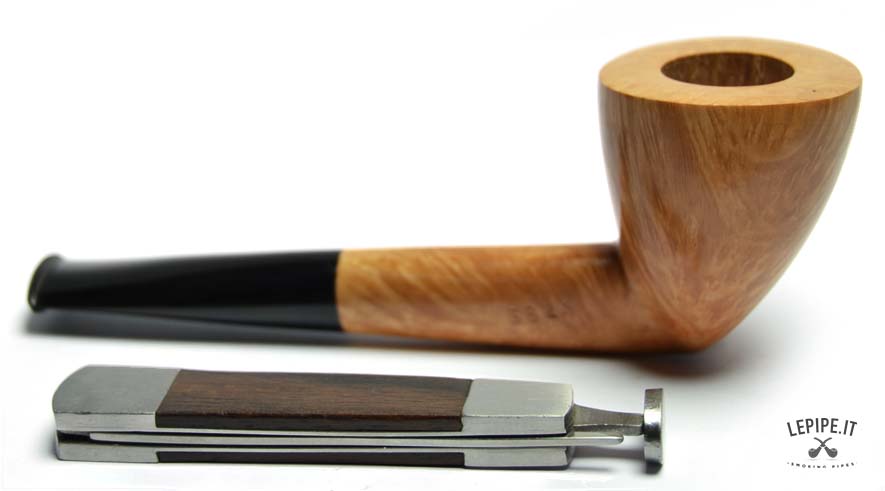 Questa pipa Bacigalupi dalla forma Dublin rappresenta l’essenza della semplicità raffinata e dell’equilibrio formale. Realizzata in radica chiara di alta qualità, la superficie liscia e naturale mette in risalto le venature del legno, conferendo alla pipa un’eleganza sobria e senza tempo. La classica silhouette conica della Dublin, slanciata e bilanciata, si unisce alla maestria costruttiva di Marco Bacigalupi, che adotta una particolare tecnica di foratura: il foro del cannello è praticato più in basso, così da trovarsi al centro del fornello, garantendo una combustione più omogenea e facilitando la formazione della camicia protettiva. Il bocchino in ebanite, realizzato a mano, si inserisce armoniosamente nella linea della pipa, offrendo una sensazione morbida al morso e un ottimo comfort durante la fumata. Il marchio 2 Ancore inciso sul lato certifica l’unicità e la posizione di questa pipa all’interno della produzione annuale del maestro. Un oggetto autentico, essenziale e profondamente curato in ogni dettaglio.