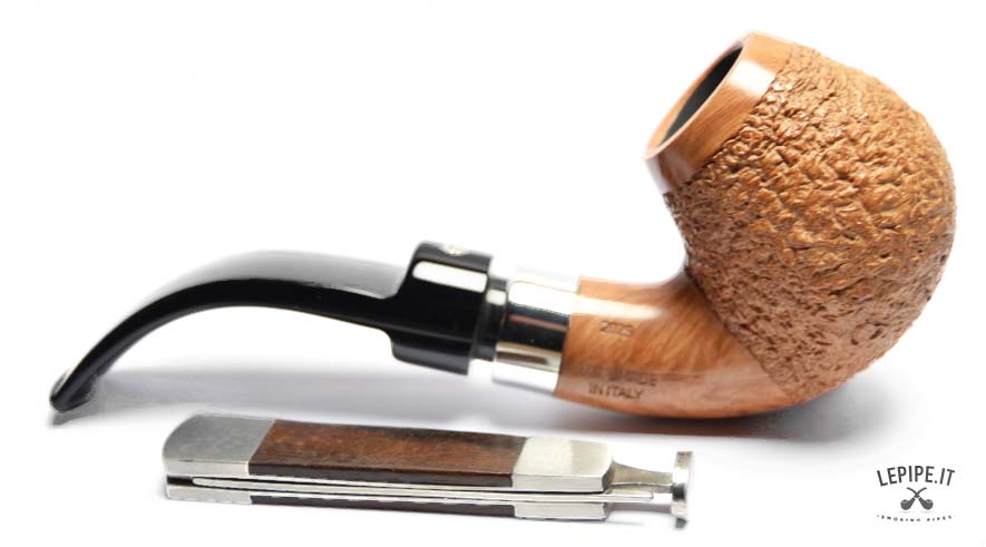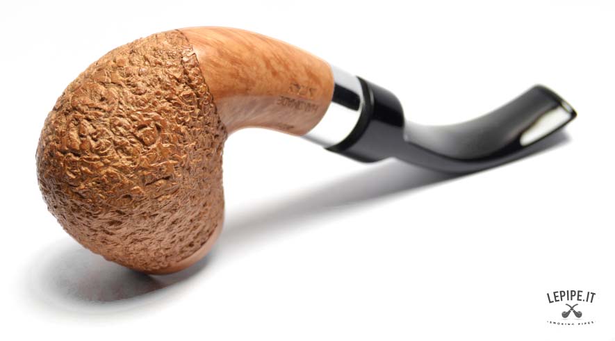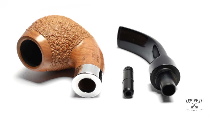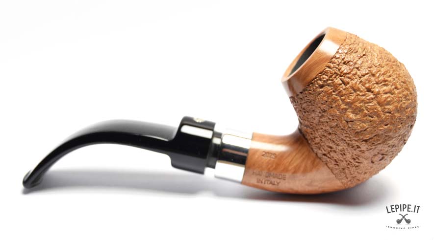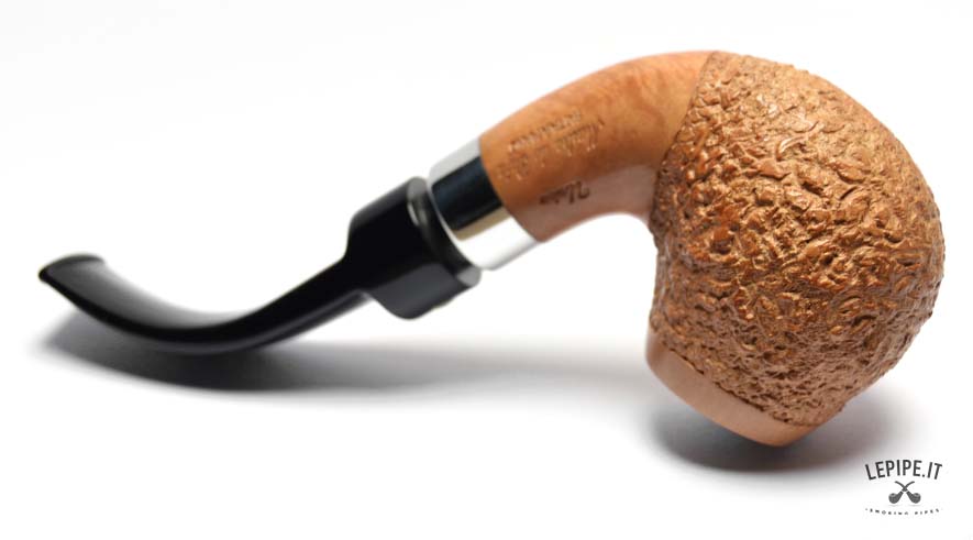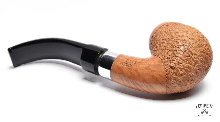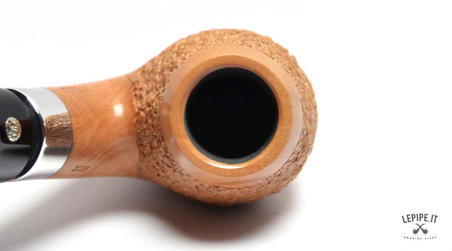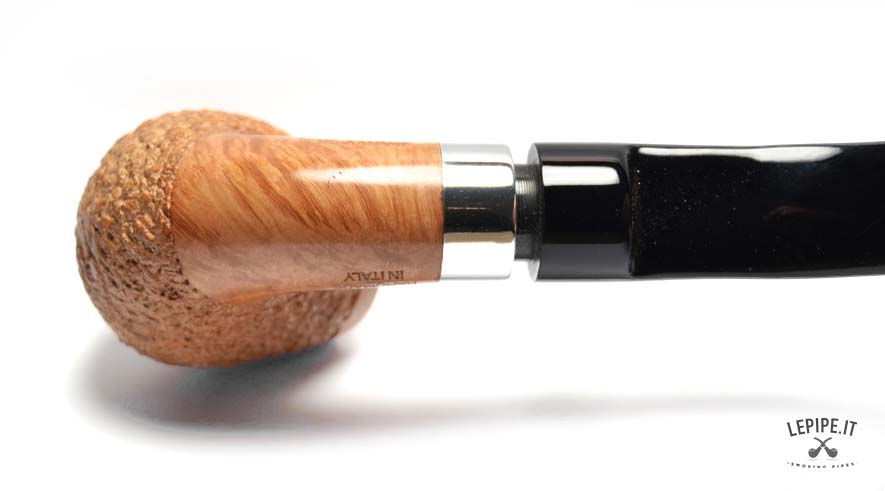 Il fornello è caratterizzato da una marcata finitura rusticata che dona profondità e un forte impatto visivo alla radica, mentre il bordo superiore liscio crea un piacevole contrasto con la superficie lavorata. Il cannello mantiene una linea pulita ed è impreziosito da una ghiera metallica lucida che accompagna elegantemente il passaggio verso il bocchino.